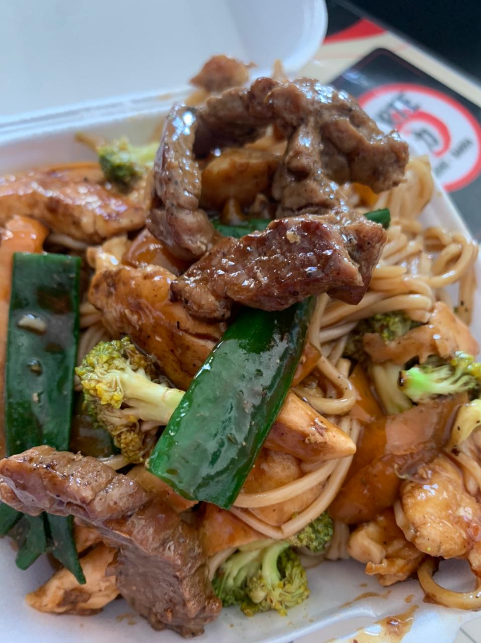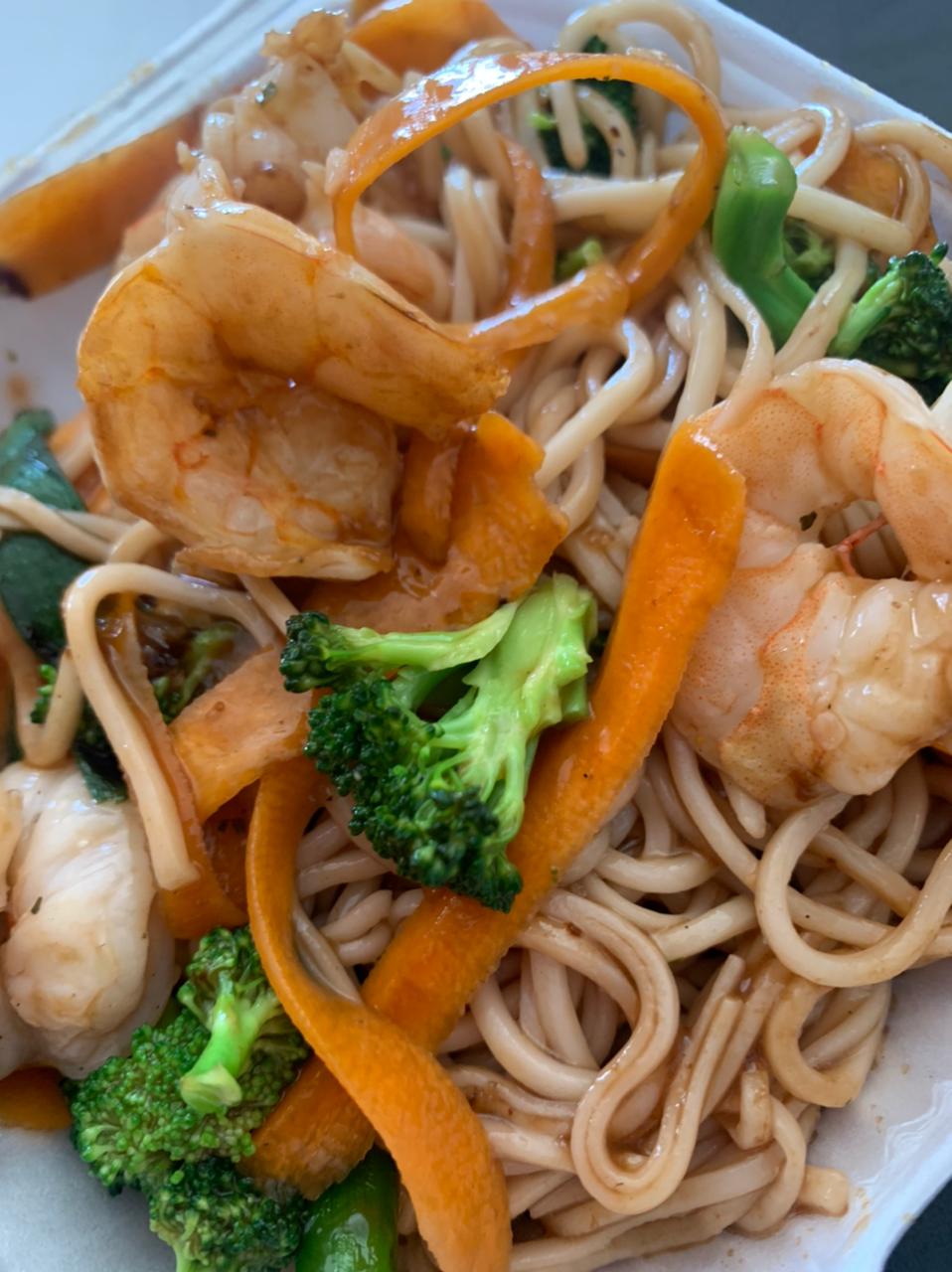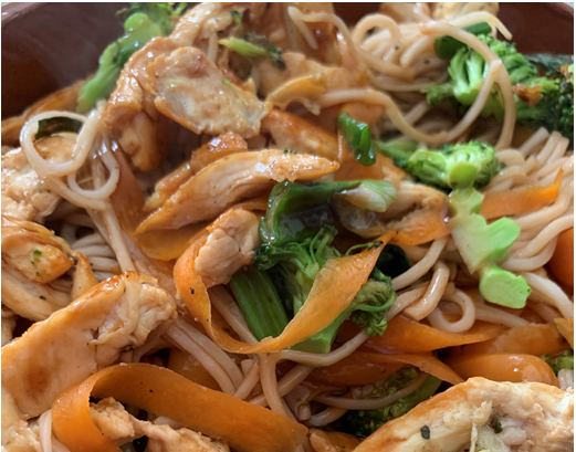 Pasta de trigo, acompañada de zanahoria,cebollín y brócoli, y bañada en salsa agridulce