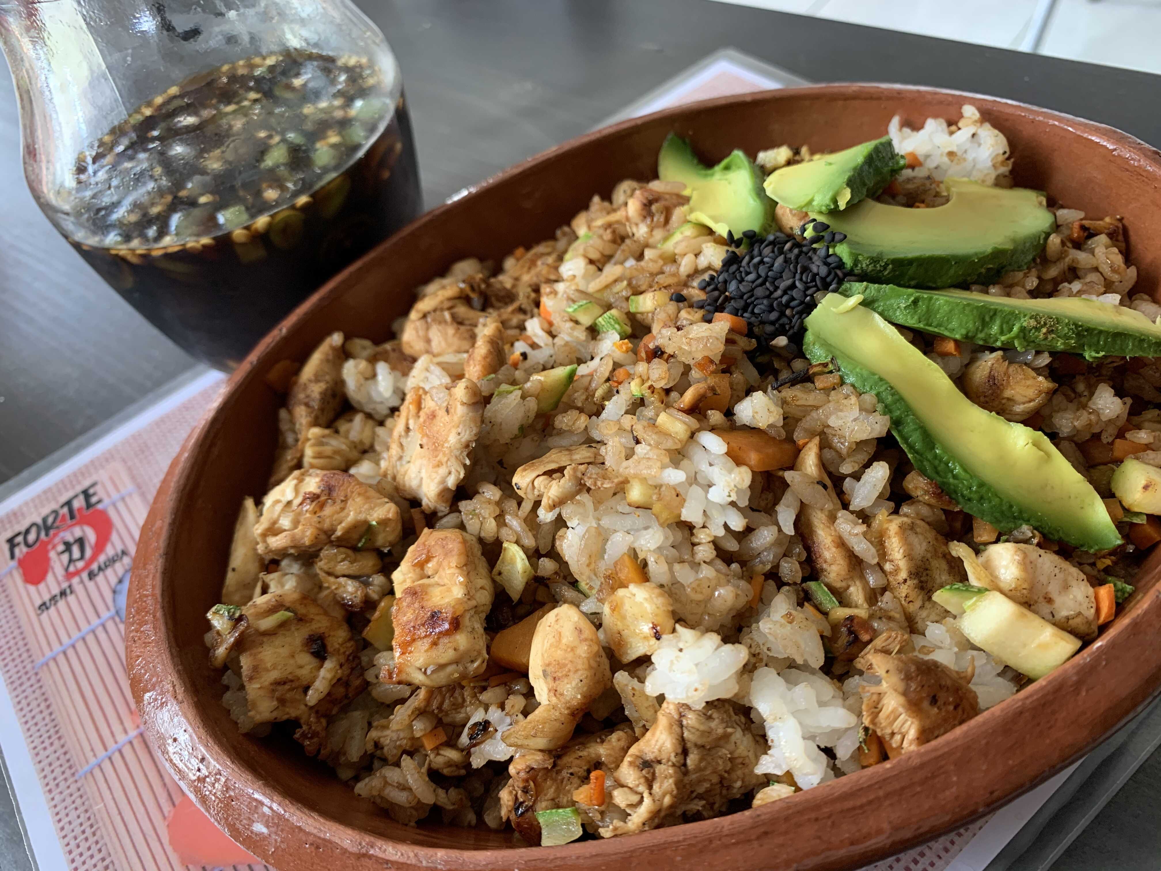 Camarón, pollo y arrachera verduras a la plancha y doble porción de arroz