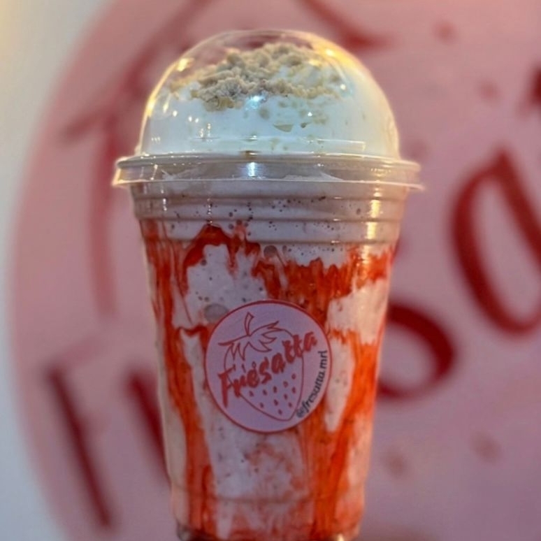 Malteada de fresa, untable, crema batida y topping.