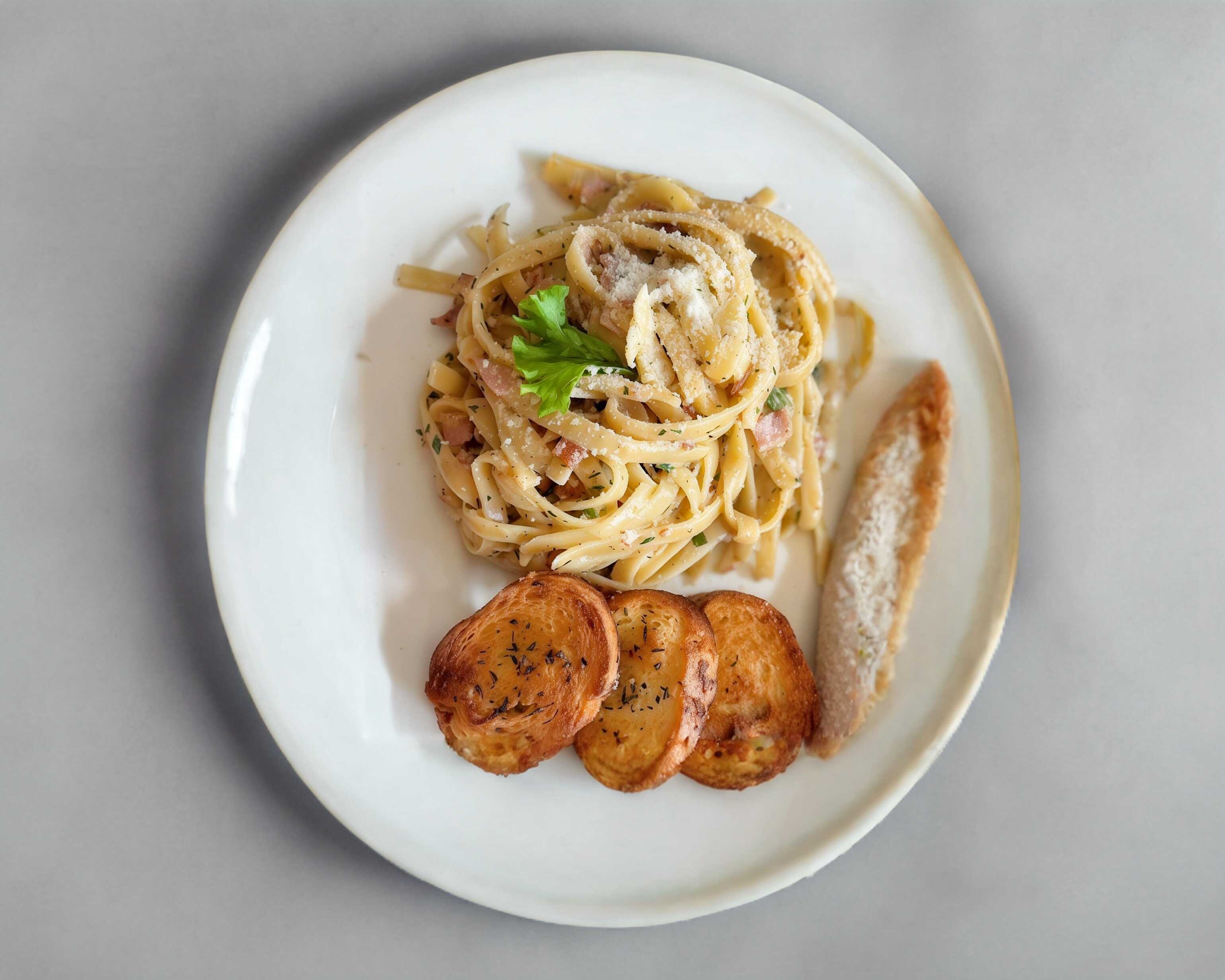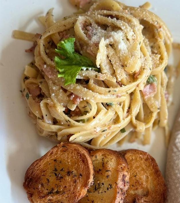 Clásica pasta cremosa con Parmesano, tocino y jamón de pavo, Sazonada con hierbas finas , Acompañada con pan de ajo.