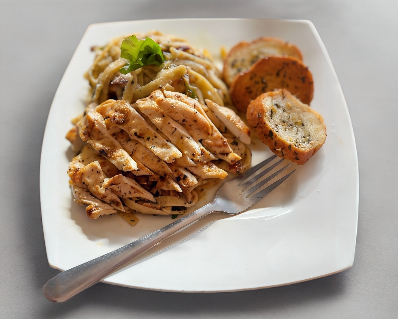 Clásica pasta cremosa con Parmesano, tocino y jamón de pavo, sazonada con hierbas finas, acompañada con pan de ajo y un extra de pollo