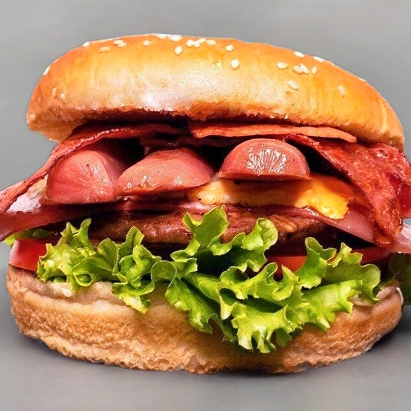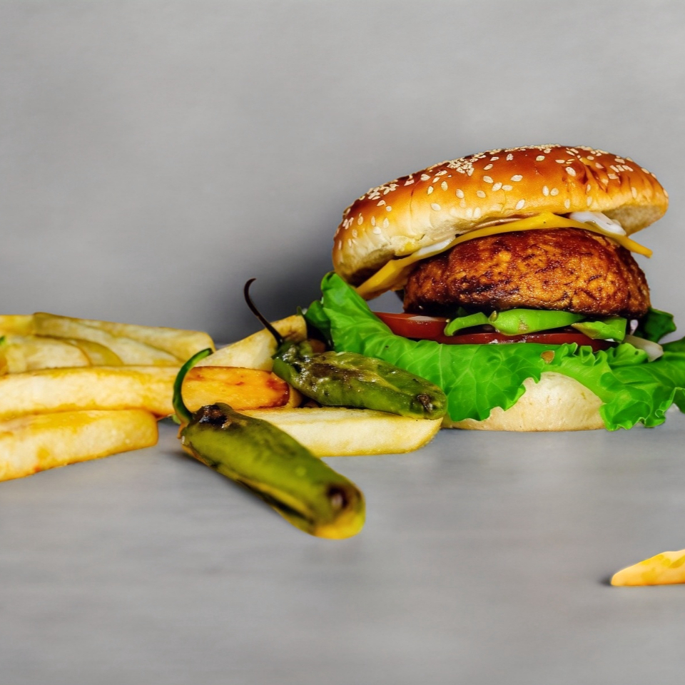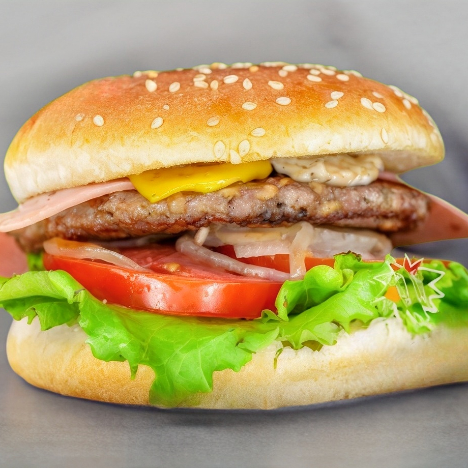 100% carne de res o pollo, queso amarillo, verduras, puedes pedirla en combo en el área de combos.