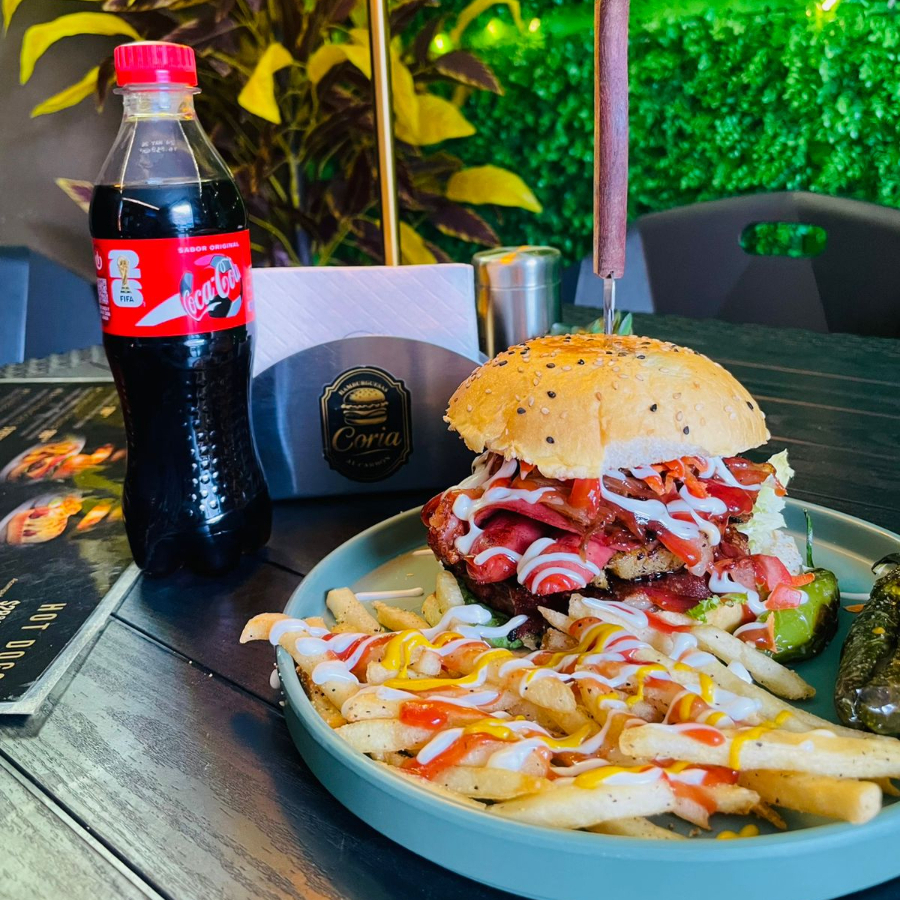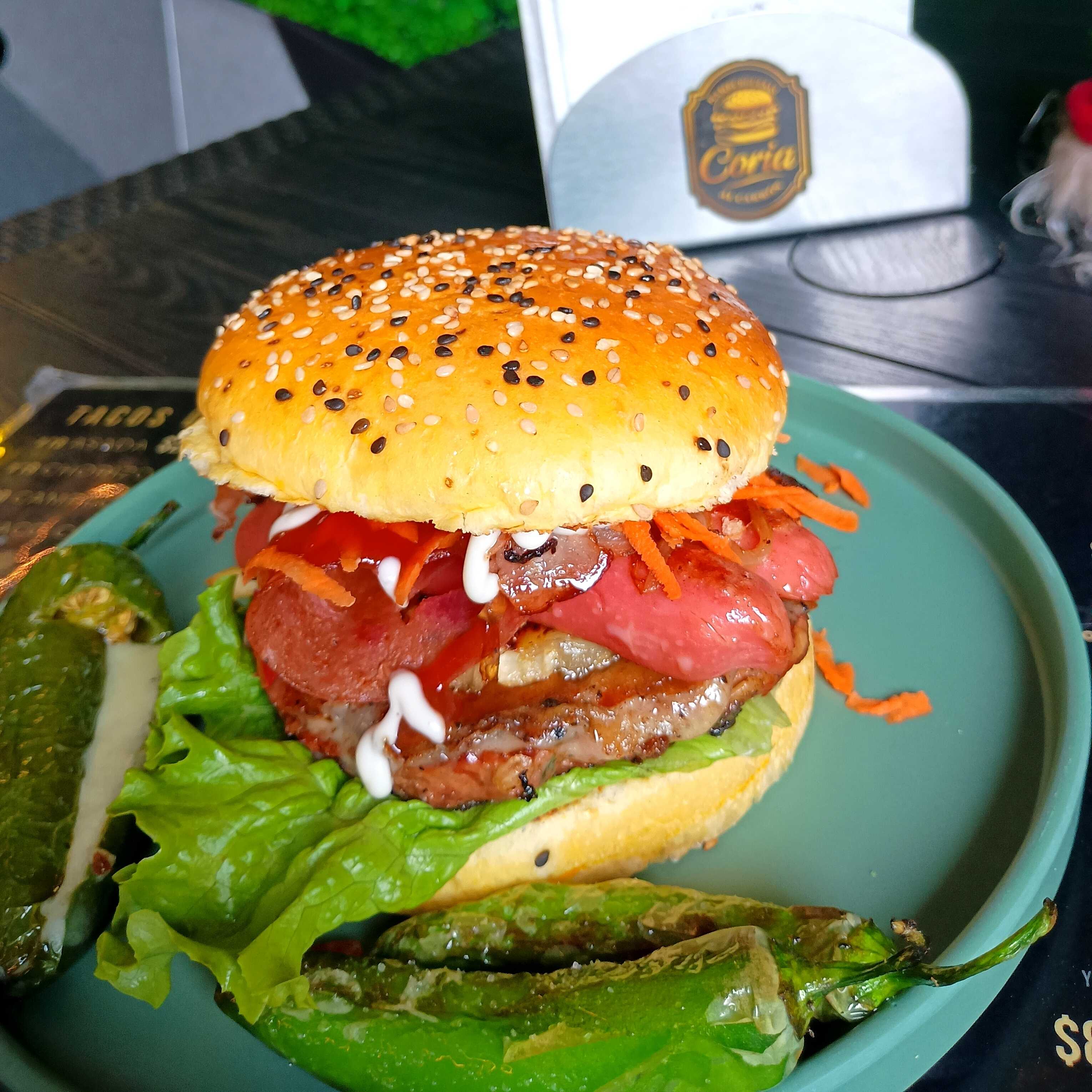 Hamburguesa con pan 100% artesanal 120gr de carne de res con la receta de la casa, costra de queso mozarella, tocino ahumado, Salchicha de pavo Zanahoria rallada Jitomate picado Jalapeño relleno de queso mozarella, Ketchup, Moztaza, Mayonesa, 100gr de Papas a la francesa salpimentad, Coca-Cola de 400ml