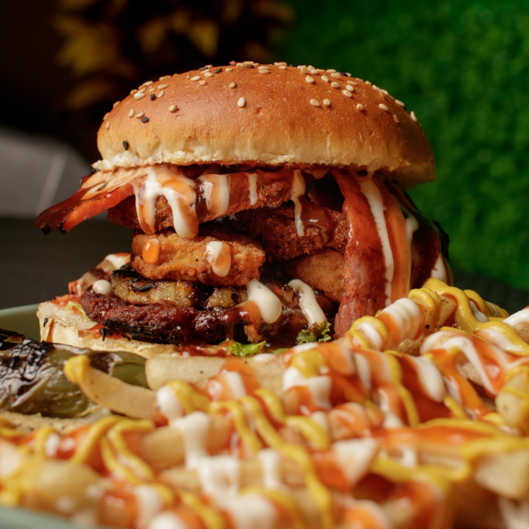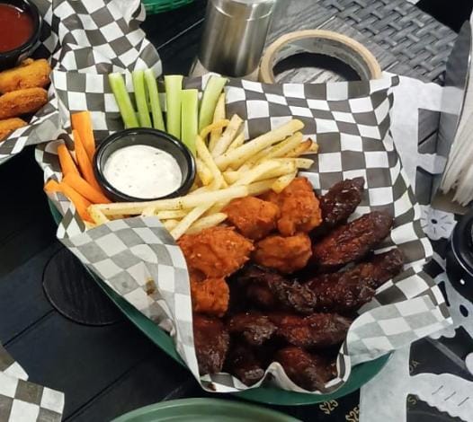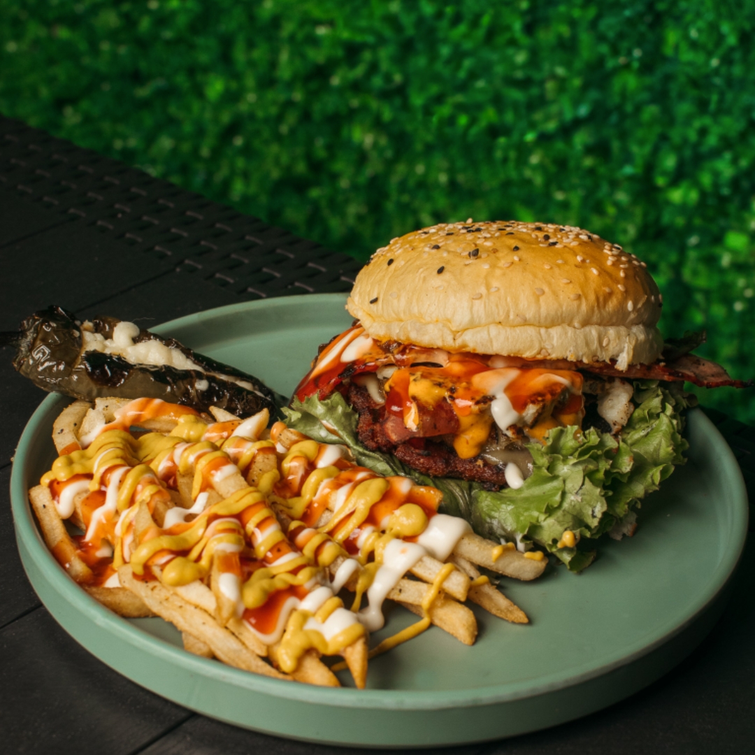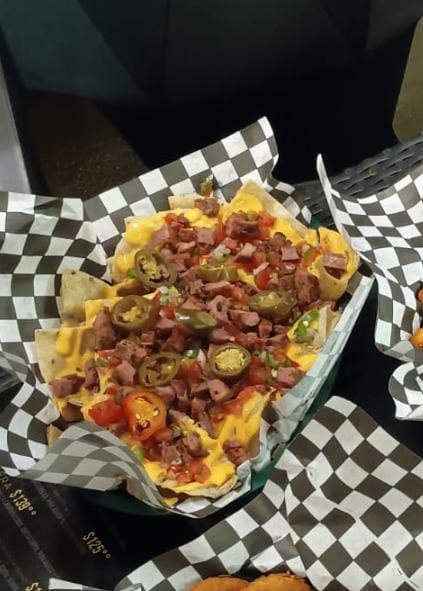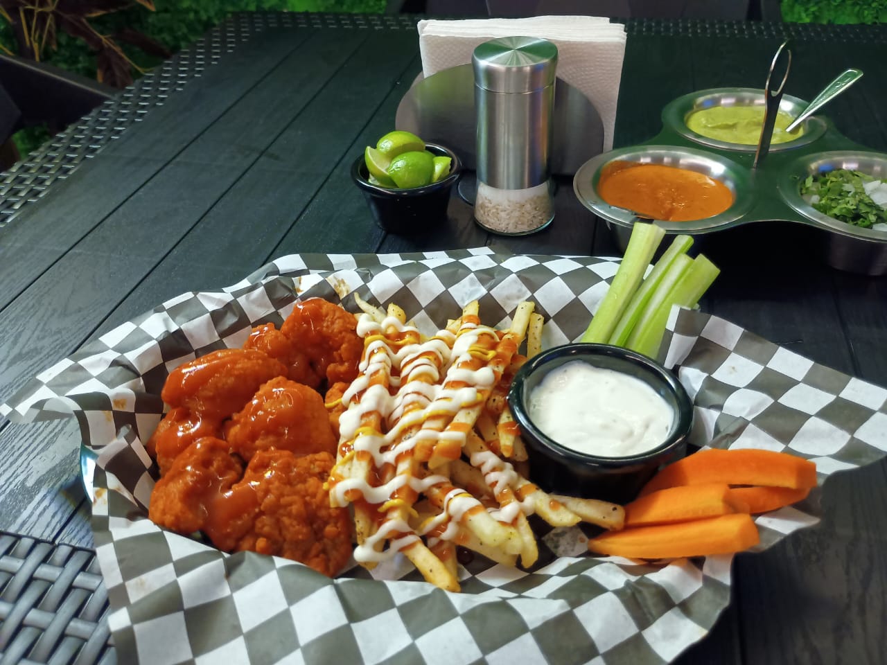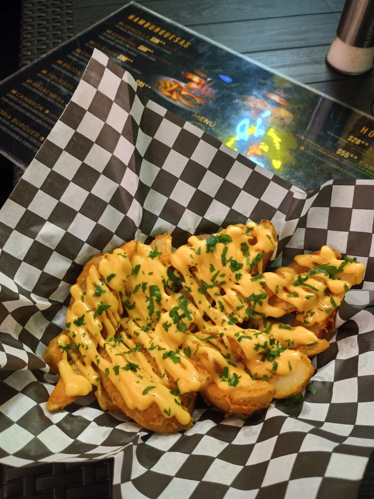 Carne de res jugosa, nuggets de pollo, aros de cebolla, queso manchego tocino y BBQ.