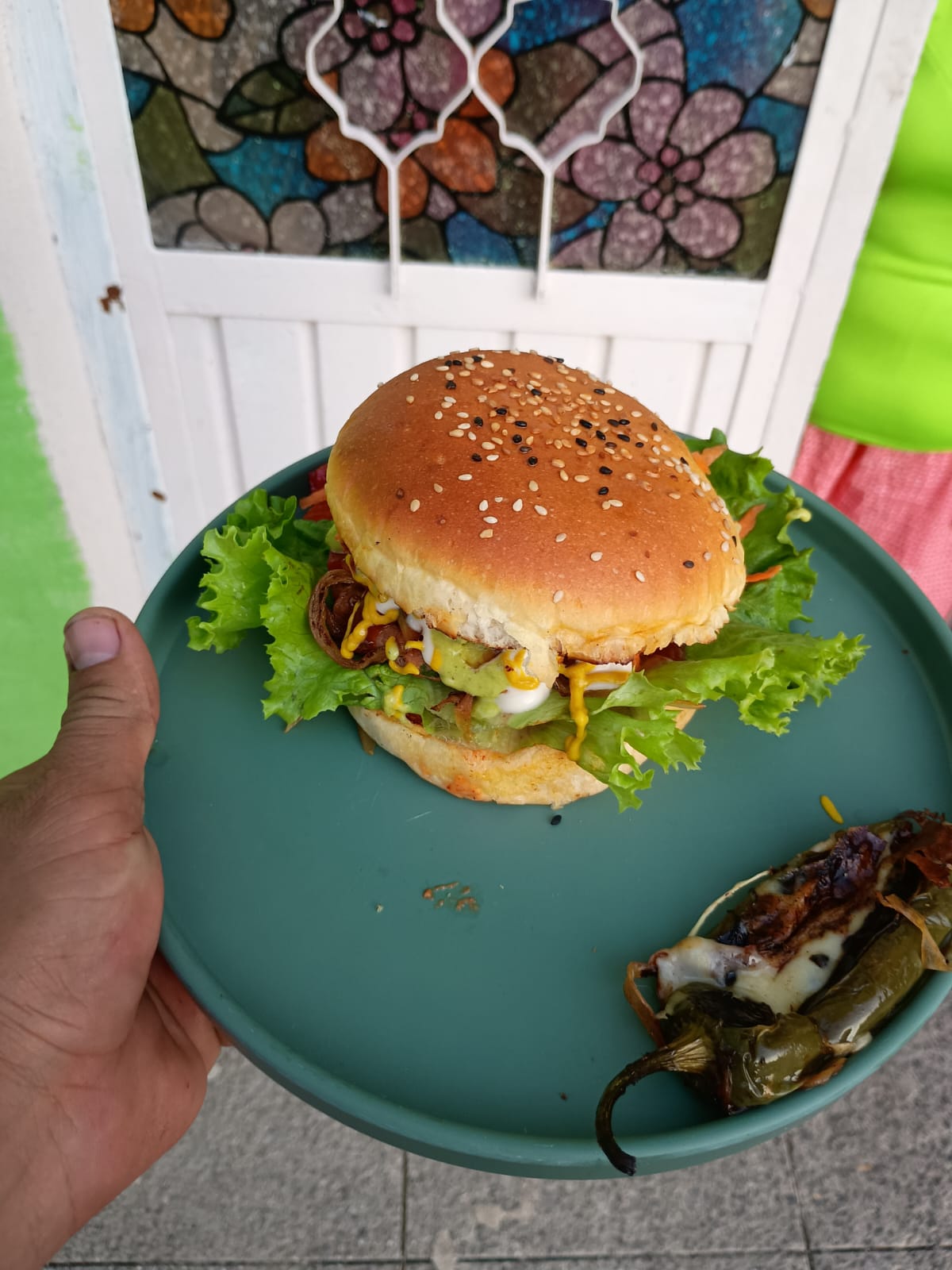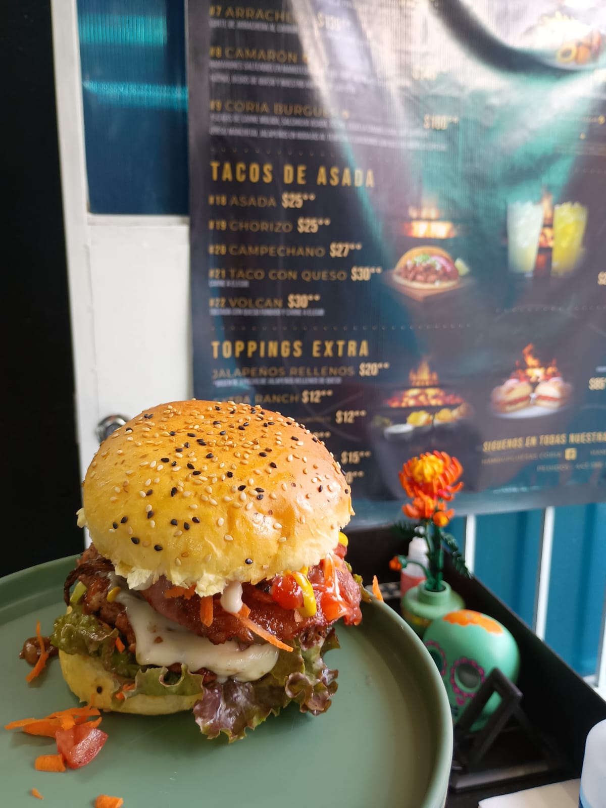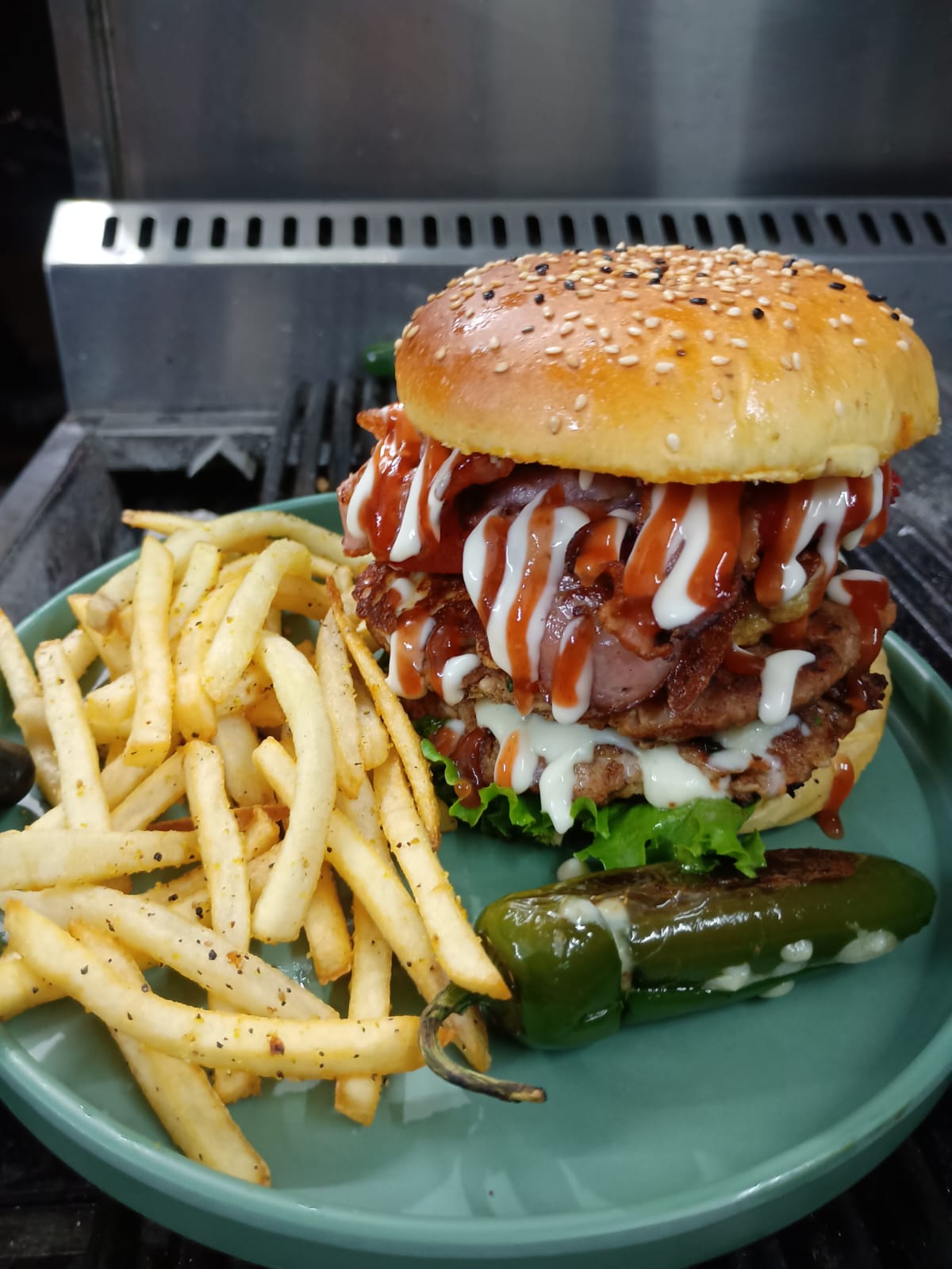150 g De carne molida, salchicha asada, tocino, cebolla caramelizada, queso gouda, queso manchego, jalapeños en rodajas al tempura y coronamos con nuestro aderezo especial.