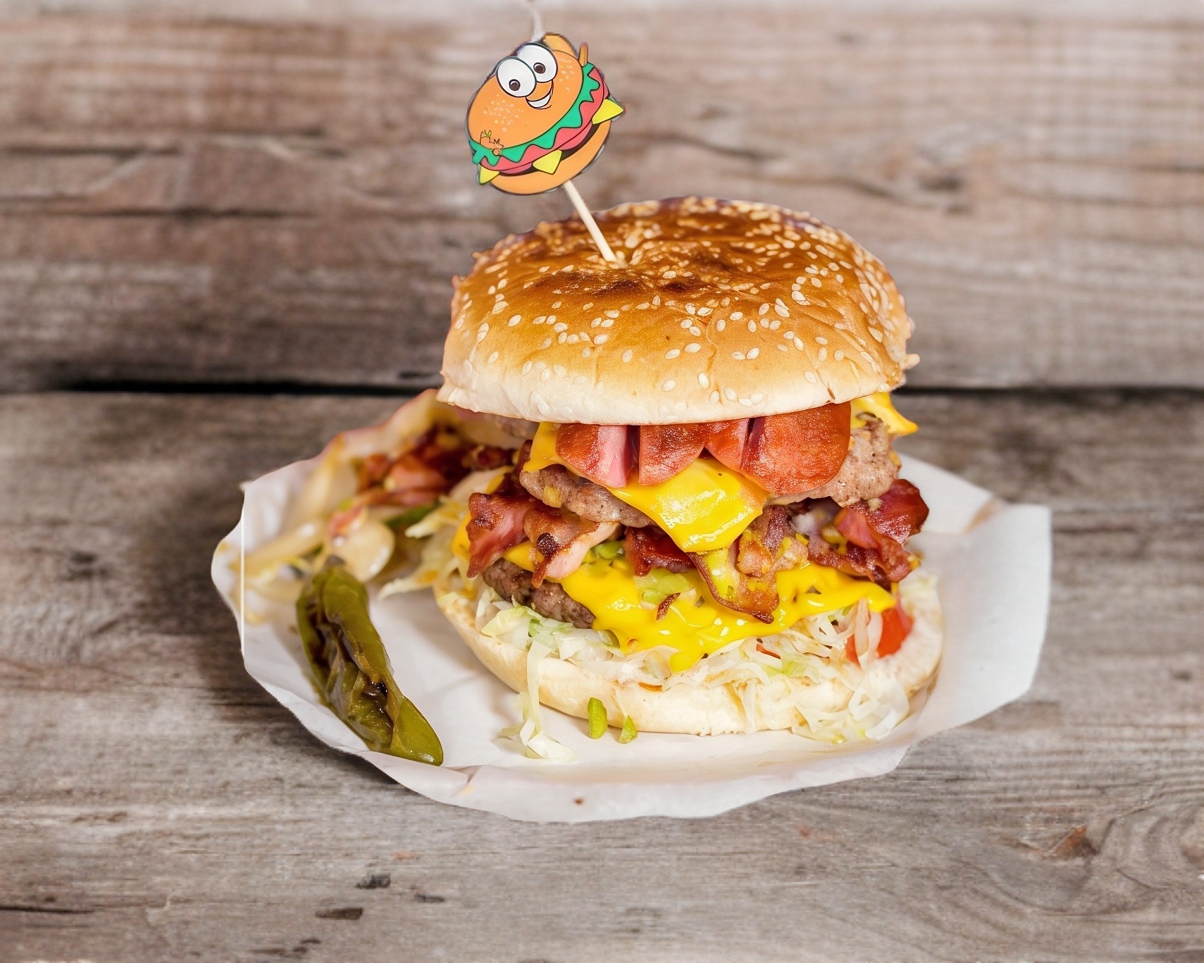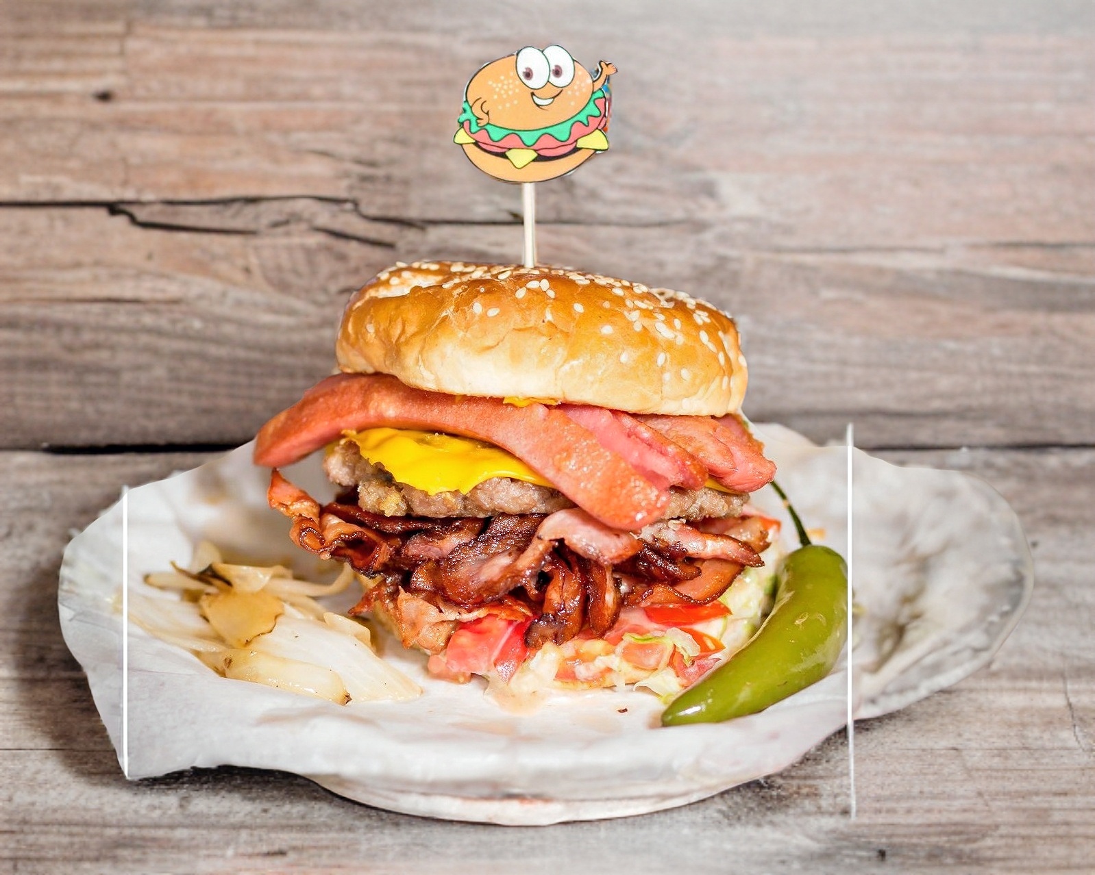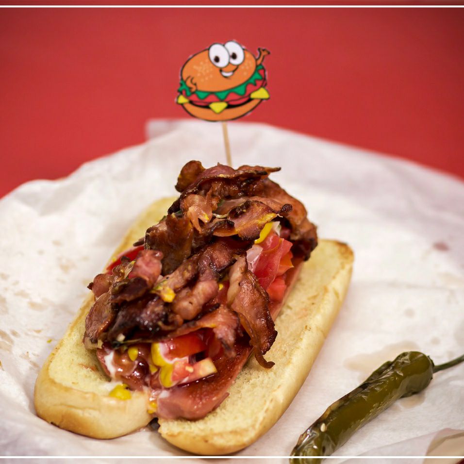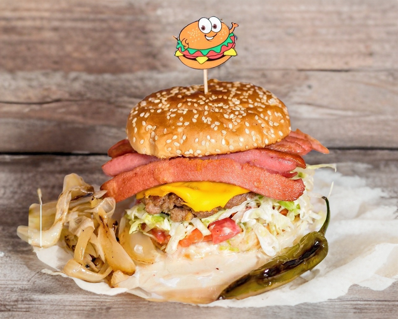 Pan grande,carne de res, tocino, salchicha de pavo,queso amarillo, verdura, crema, catsup y mostaza