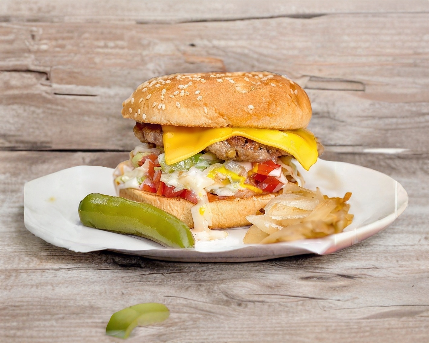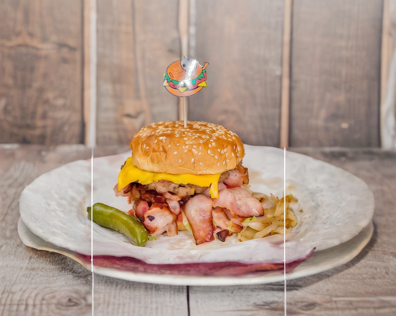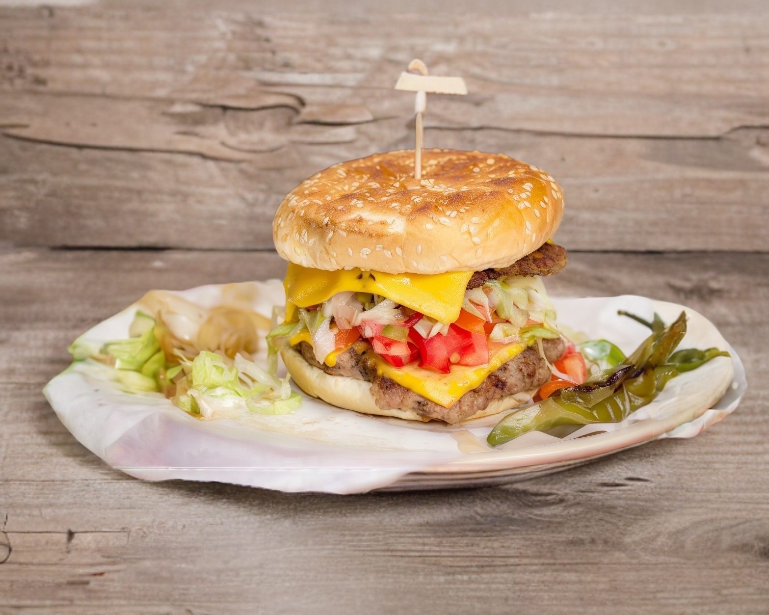Pan grande,carne de res, tocino, salchicha de pavo,queso amarillo, verdura, crema, catsup y mostaza