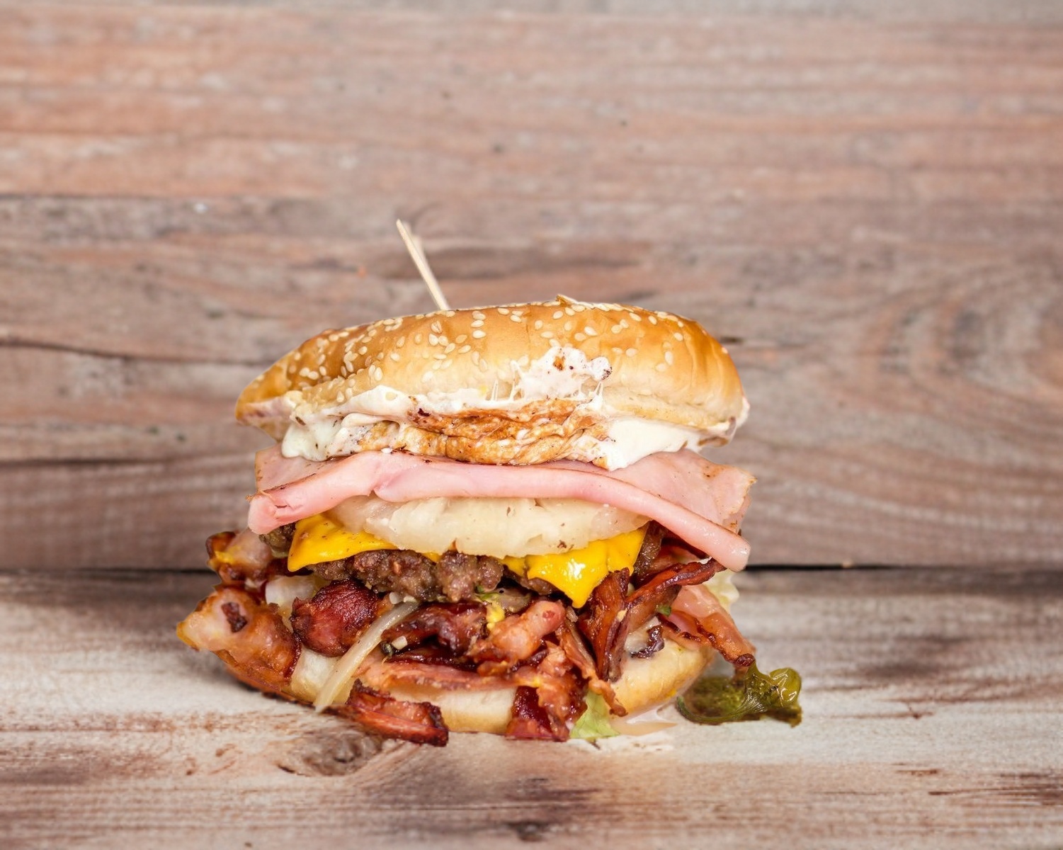 Pan grande, carne de res, jamon, tocino, piña,queso amarillo, queso blanco, verdura,crema, catsup y mostaza
