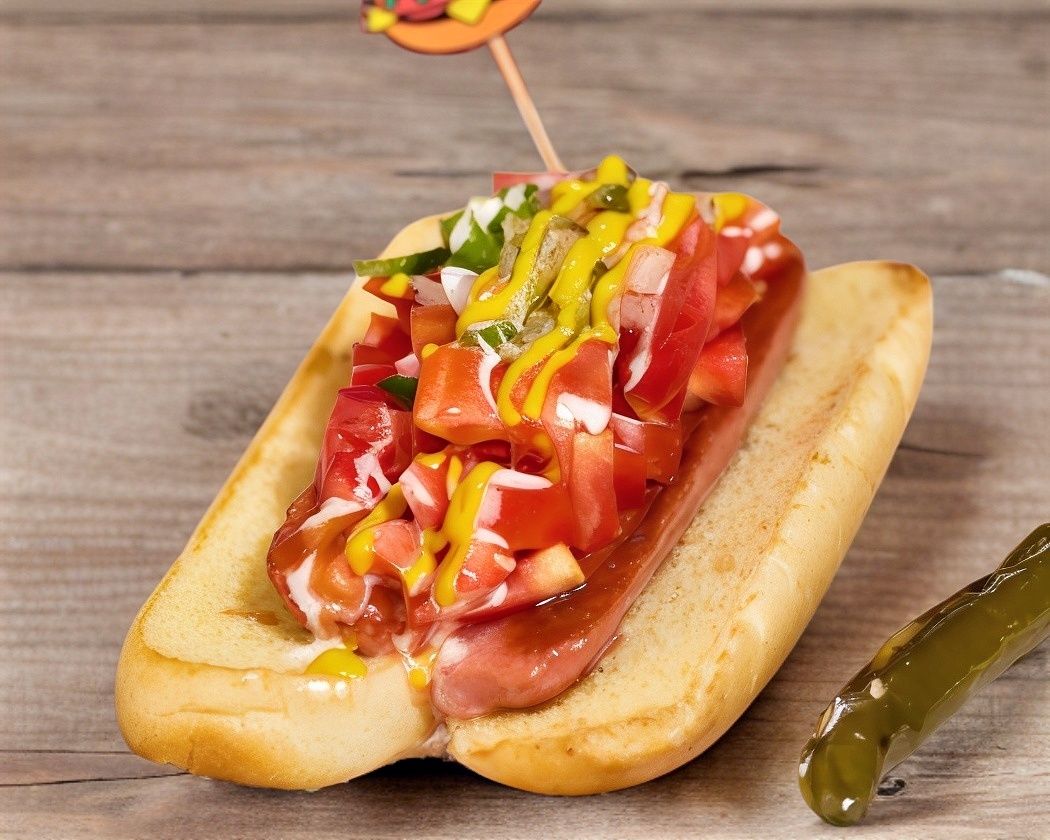 Salchicha de pavo, tocino, verdura,crema,catsup y mostaza