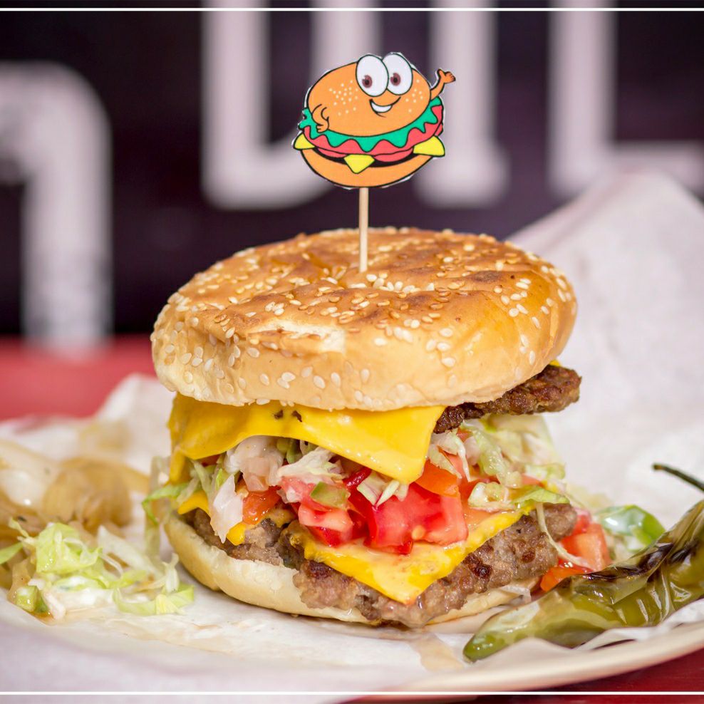Pan chico, doble carne, doble queso amarillo, verdura, crema, catsup y mostaza