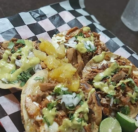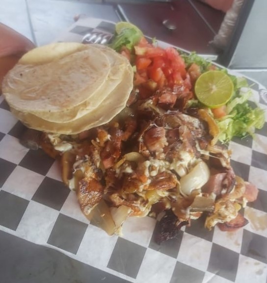 (Tortilla de harina grande, queso asadero fundido, otra tortilla arriba, bistec encebollado, trozos de piña en almíbar y nuestra tradicional salsa de jalapeño).