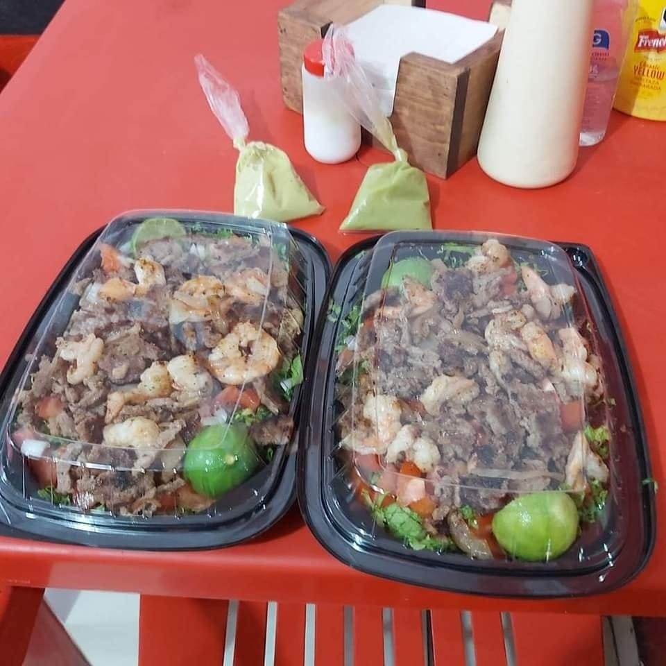 (Tortilla de harina normal, queso asadero, otra tortilla arriba, bistec encebollado, trozos de piña en almíbar, camarones a la parrilla y nuestra tradicional salsa de jalapeño).