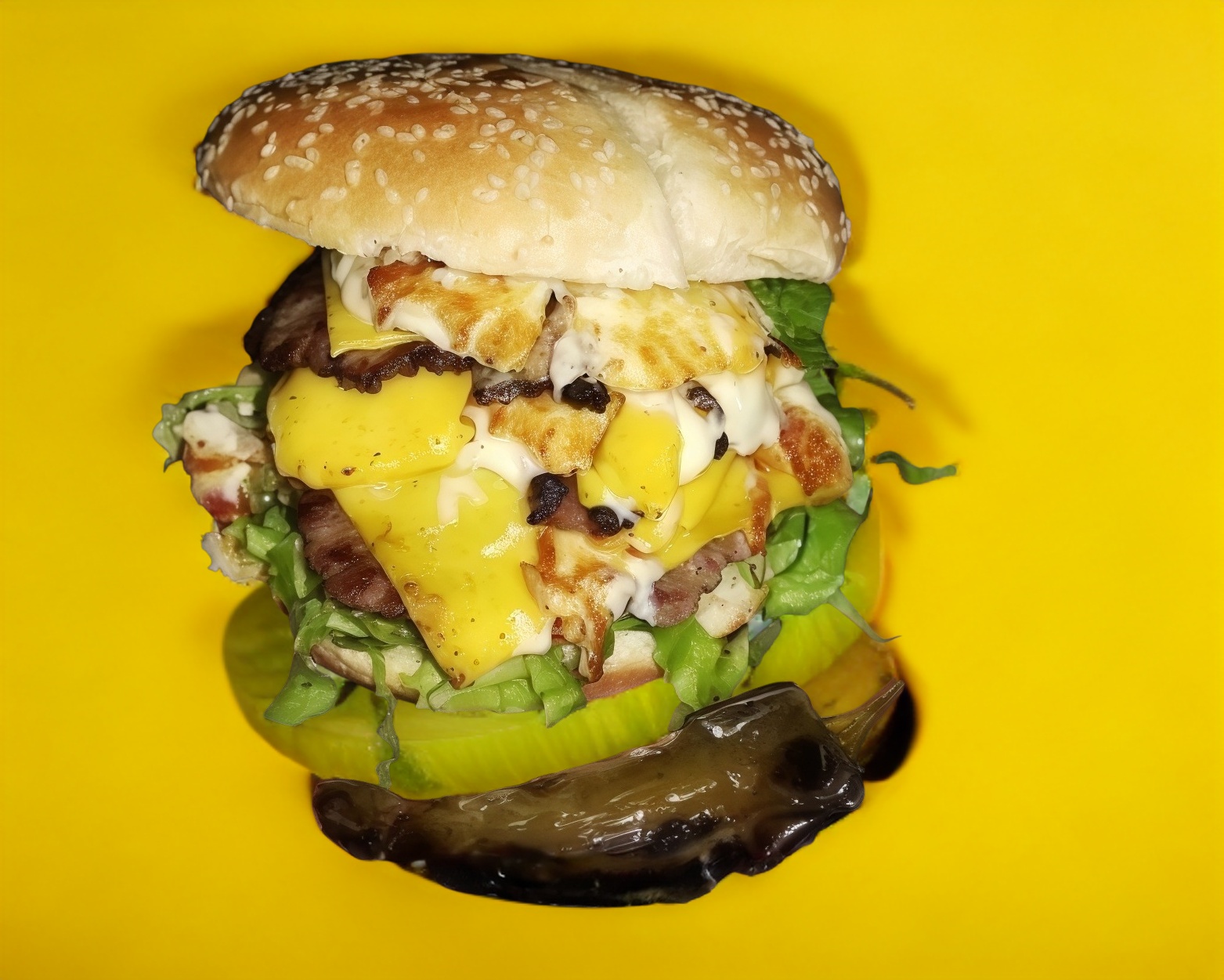 (Doble carne, doble queso amarillo, queso asadero fundido, verdura y líquidos).