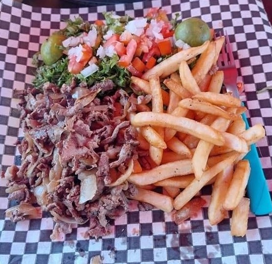 (Bistec encebollado, papas a la francesa, ensalada, tortillas de tu elección: harina o maíz. Acompañada de nuestra exquisita variedad de salsas).