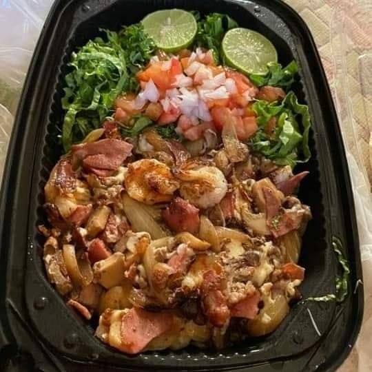 (Pan artesanal, carne deshebrada con queso asadero fundido, salchicha con tocino, camarones a la parrilla, líquidos y verdura).
