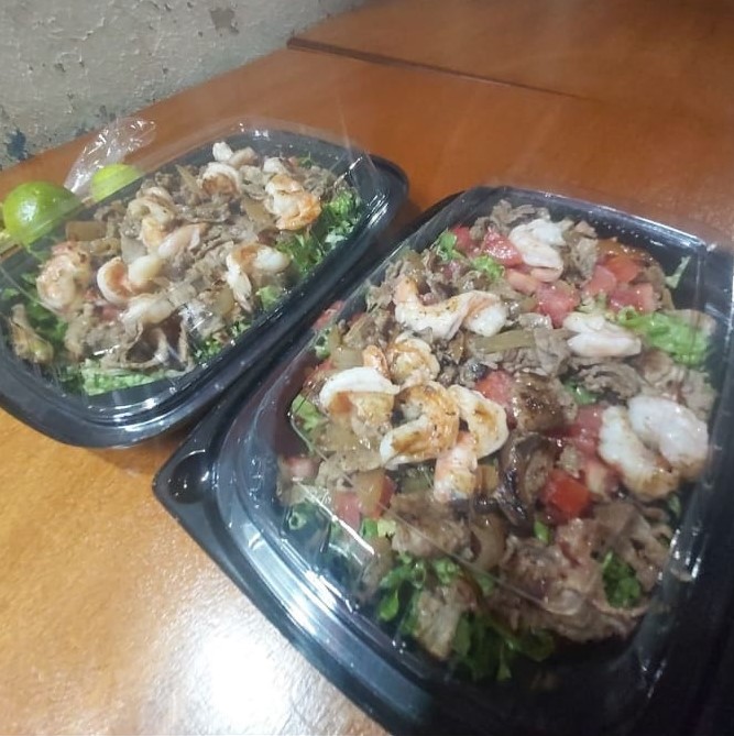 (Lechuga italiana, acompañada de trozos de jitomate bola, cebolla blanca, bistec encebollado, camarones a la parrilla y trozos de carne de hamburguesa).