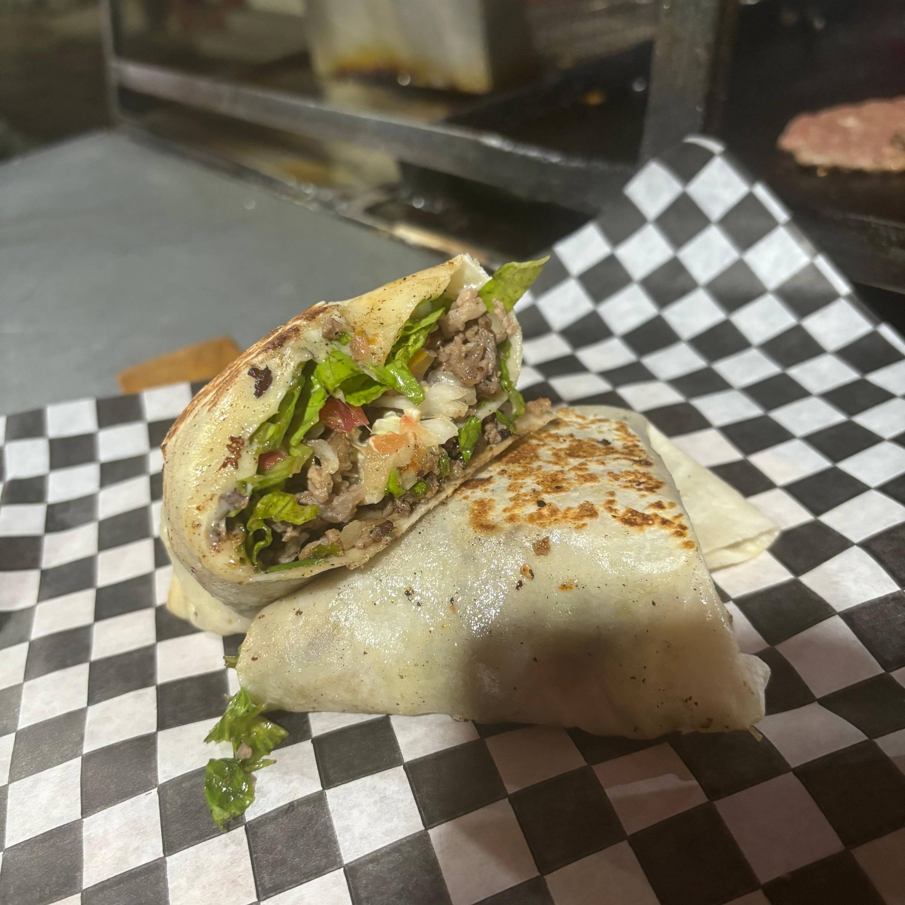 (Tortilla de harina grande, queso asadero fundido, carne de tu elección: bistec, chorizo o pastor, camarones a la parrilla, verdura y líquidos).