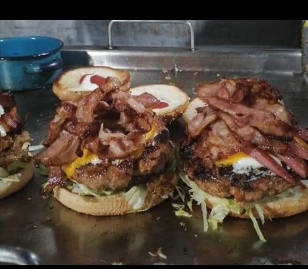 Carne extra gruesa, mucho tocino, papá sazonada, queso oaxaca, queso amarillo, verdura como lechuga, jitomate y cebolla, con salsas.