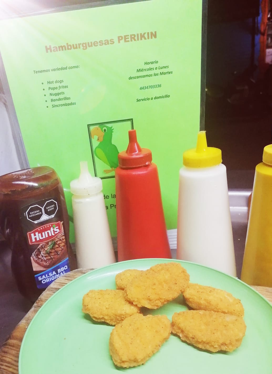 Con carne, queso manchego, queso oaxaca, queso amarillo, tocino, lechuga, jitomate, cebolla, cátsup, crema mostaza.