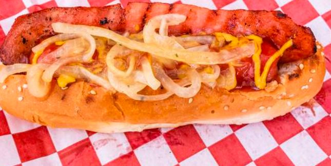 Salchicha de res, jitomate, cebolla, cátsup, crema y mostaza.