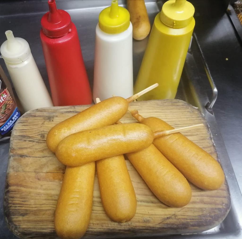 Banderilla, queso amarillo, queso oaxaca, jamón, cátsup, crema, mayonesa y mostaza.