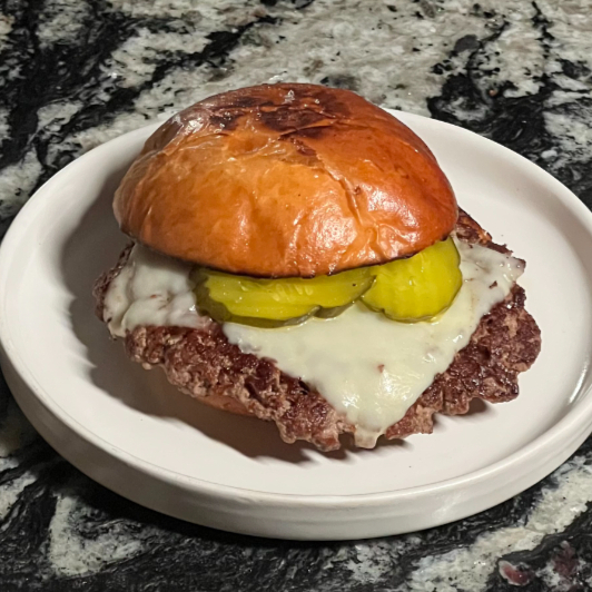 Hamburguesa 100% de res, queso cheddar suave, aderezo especial y pepinillos.
