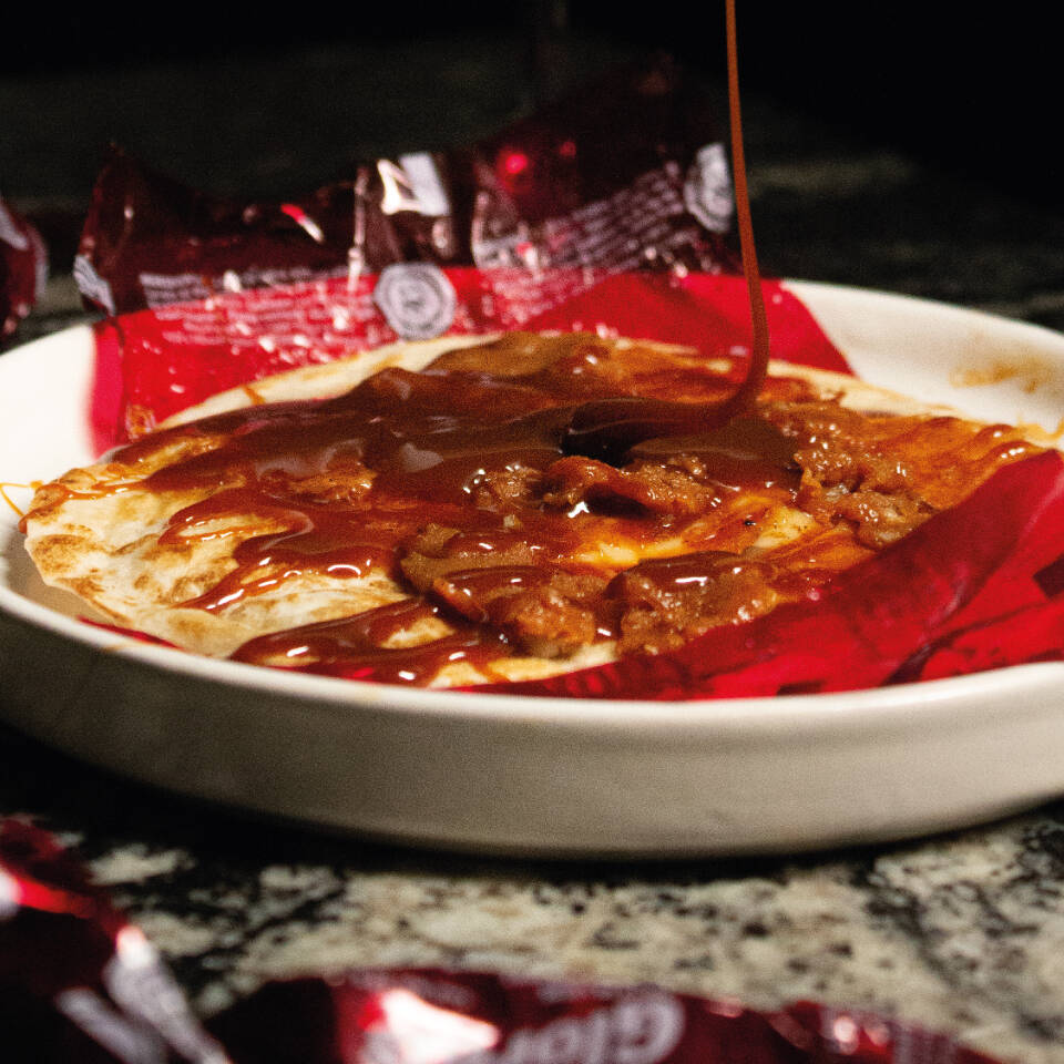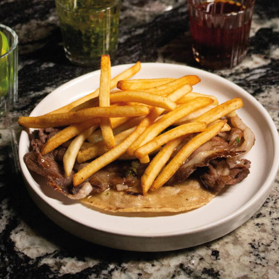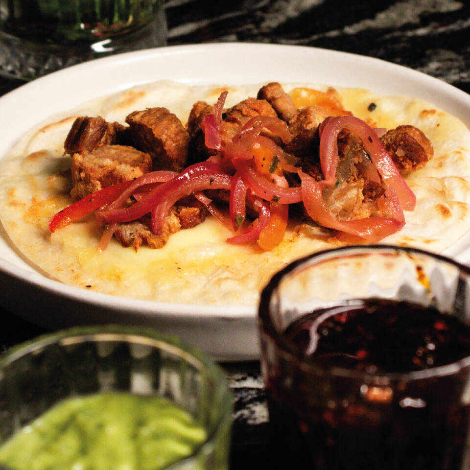 Tortilla de harina, trozos de chicharrón de pork belly, queso menonita con cebolla morada y pimientos encurtidos.