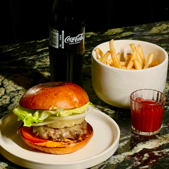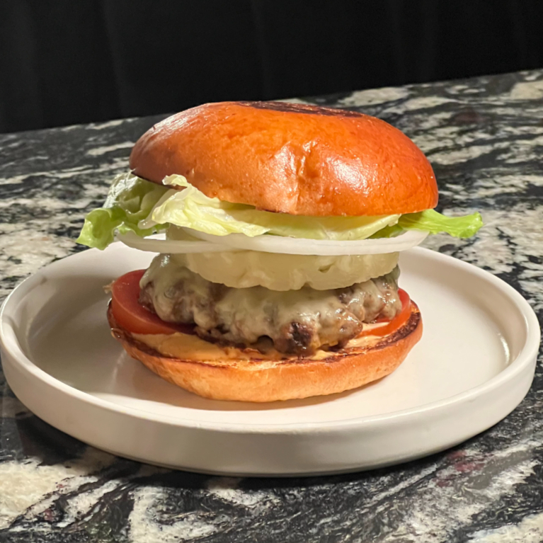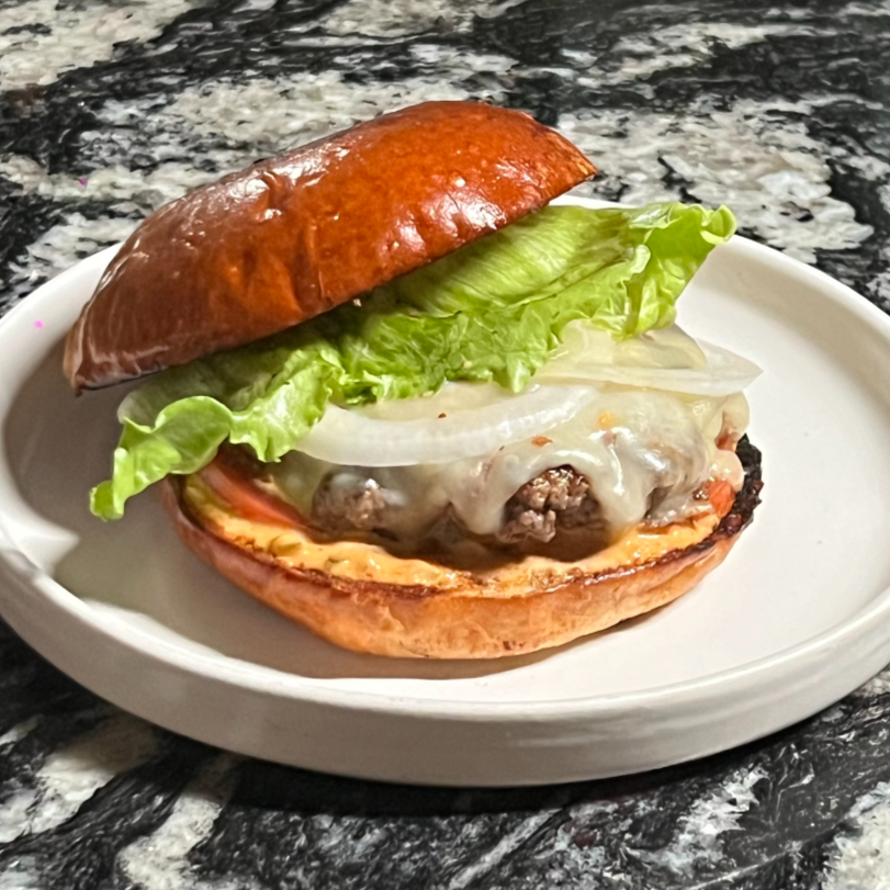 Hamburguesa 100% de res con queso cheddar suave, cabolla, jitomate, lechuga y aderezo especial.
