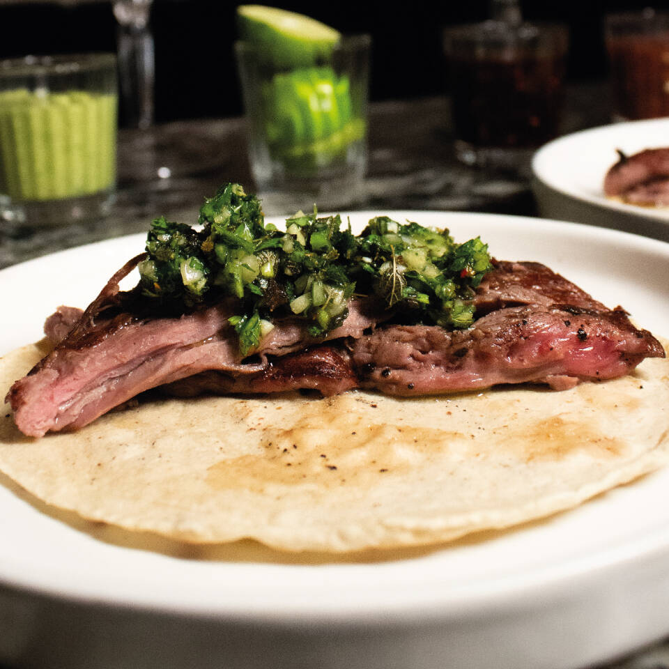 Tortilla de maíz con tiras de arrachera y chimichurri