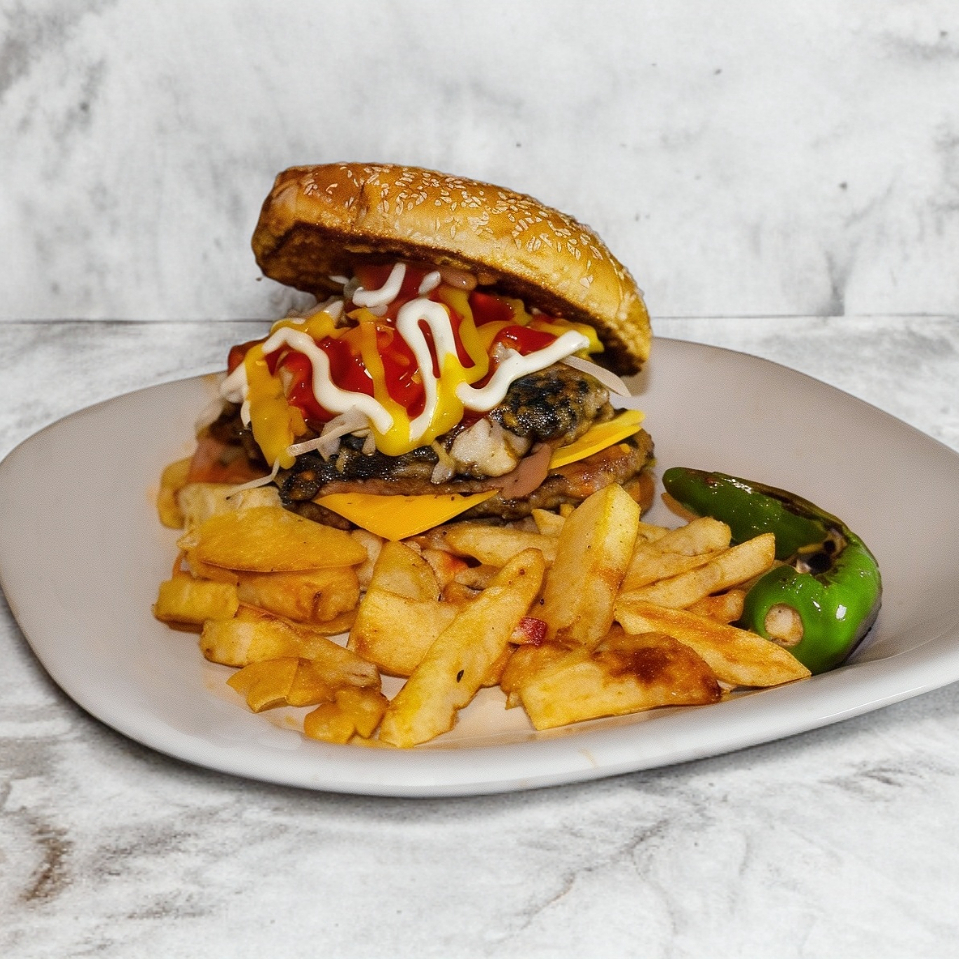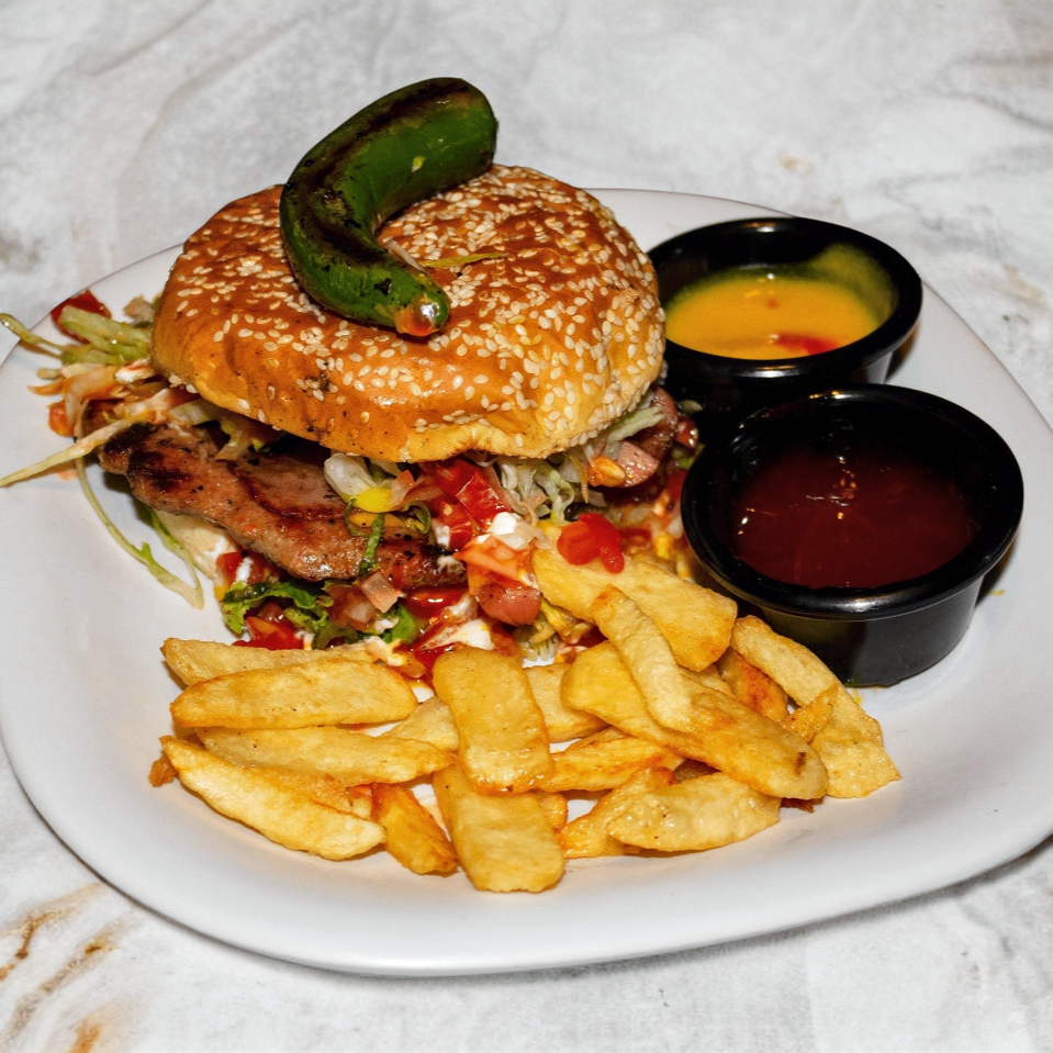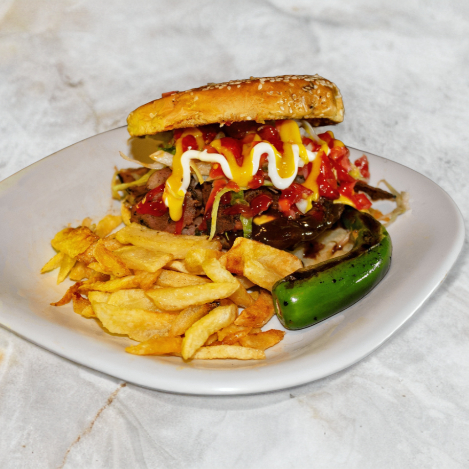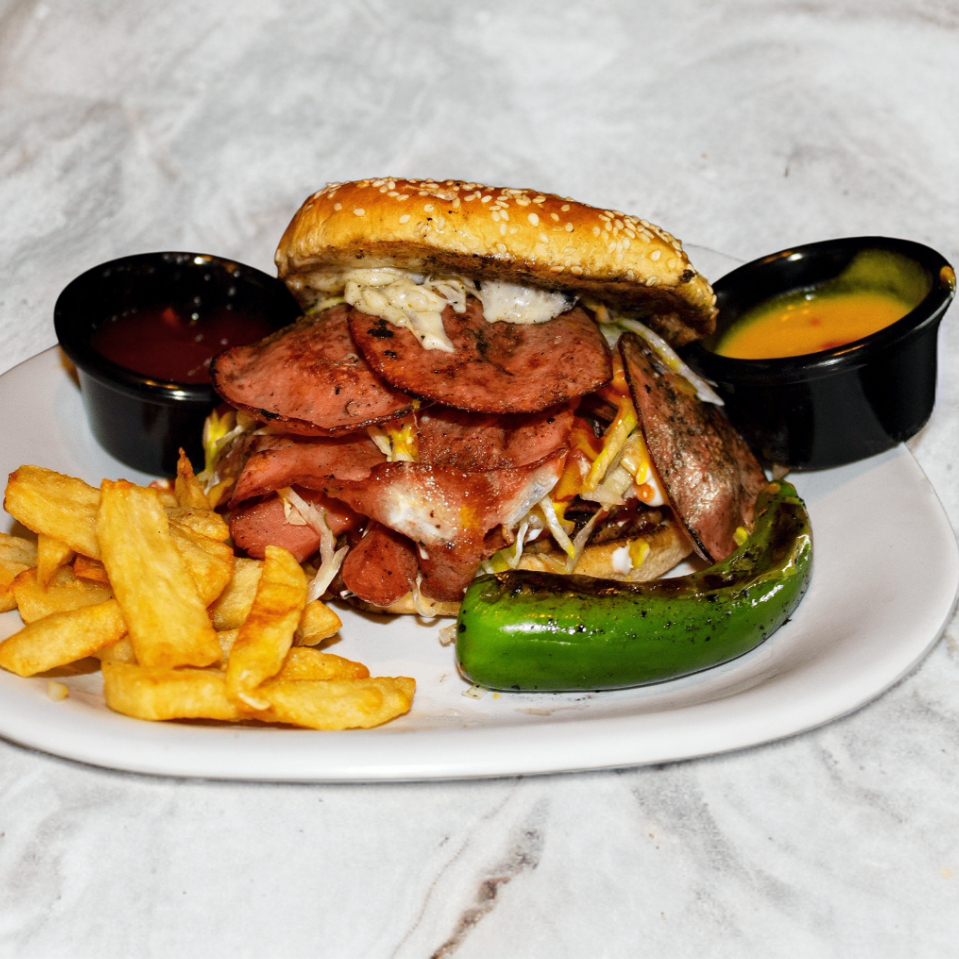 Carne de res o pollo aderezada en salsa BBQ, jamón, tocino, salchicha, queso amarillo, papas a la francesa.