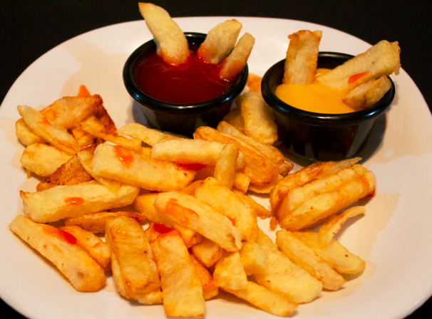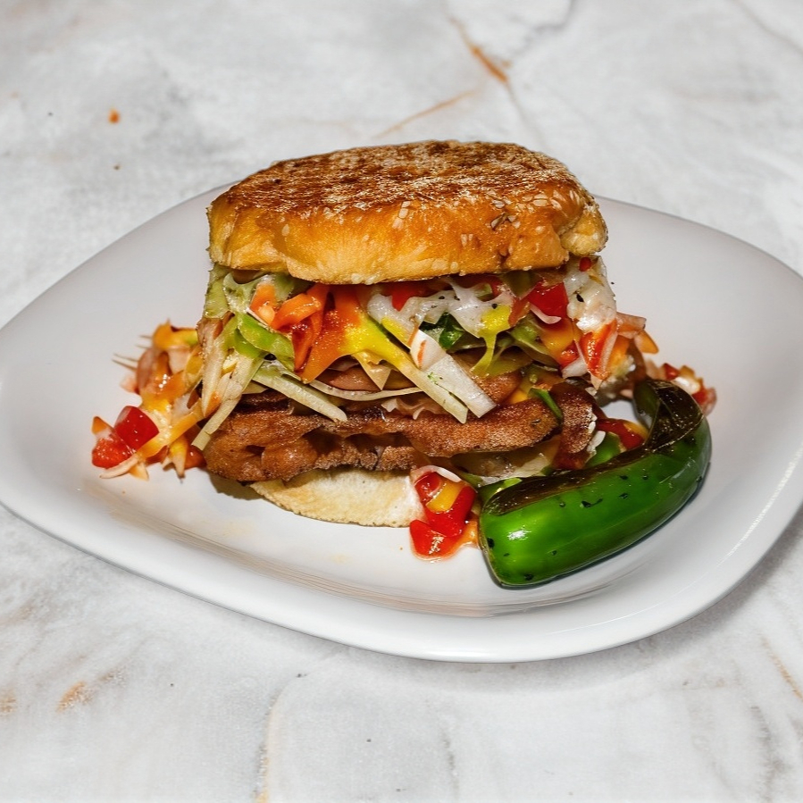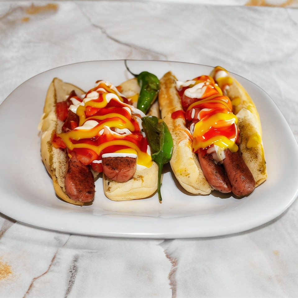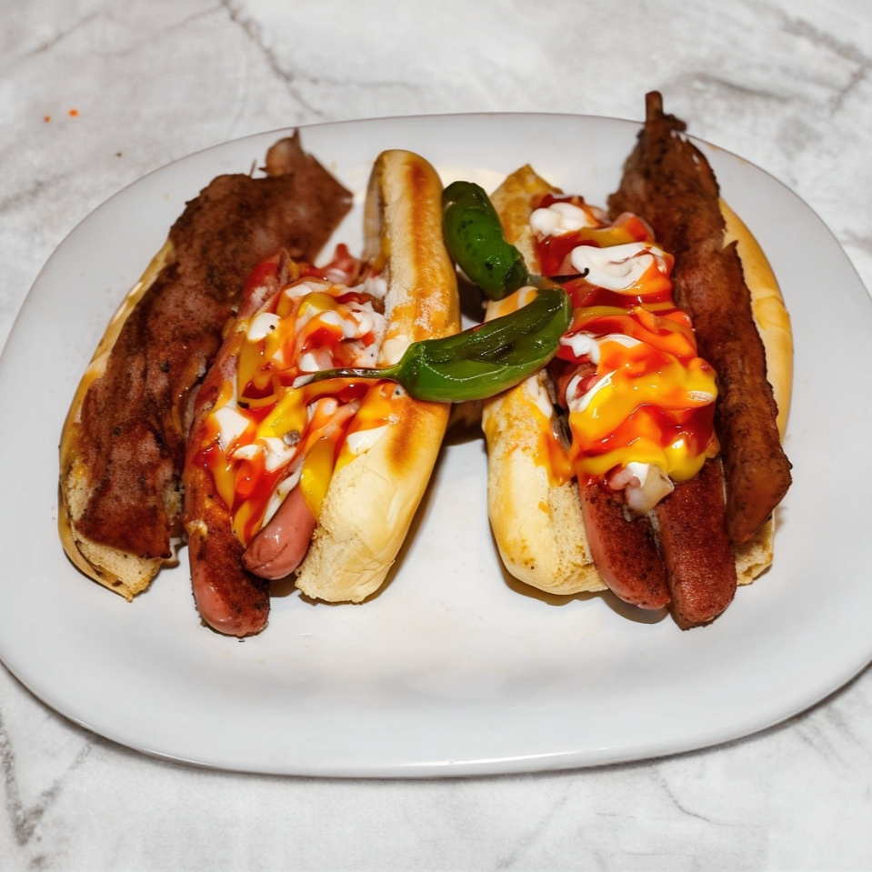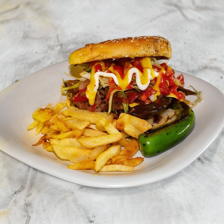 Carne de res o pollo aderezada en salsa BBQ, jamón, tocino, salchicha, queso amarillo, papas a la francesa.