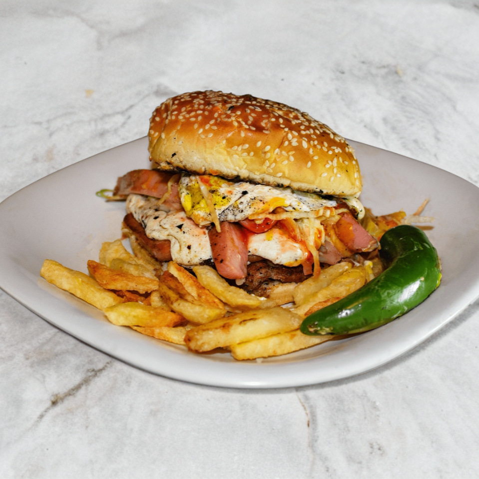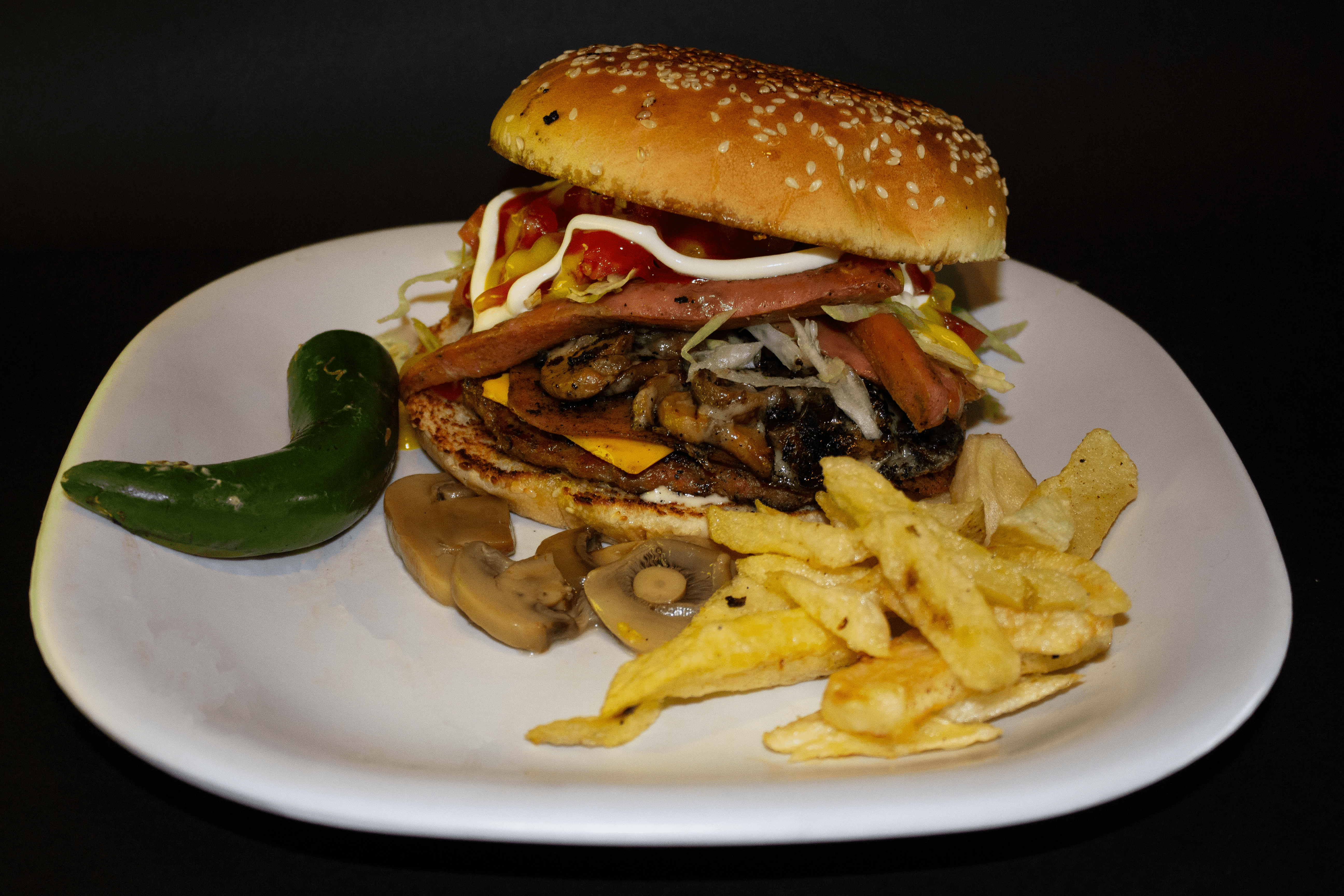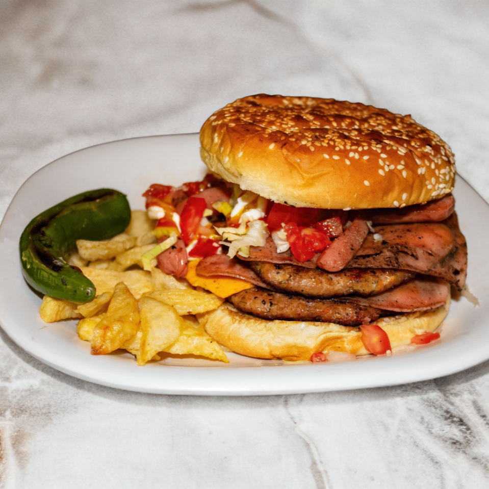 250 g de carne de res, queso amarillo, jamón, salchicha, papas a la francesa.