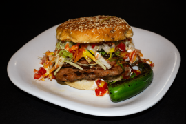 Carne de arrachera, queso amarillo, queso oaxaca, aros de cebolla, tocino, papas a la francesa.
