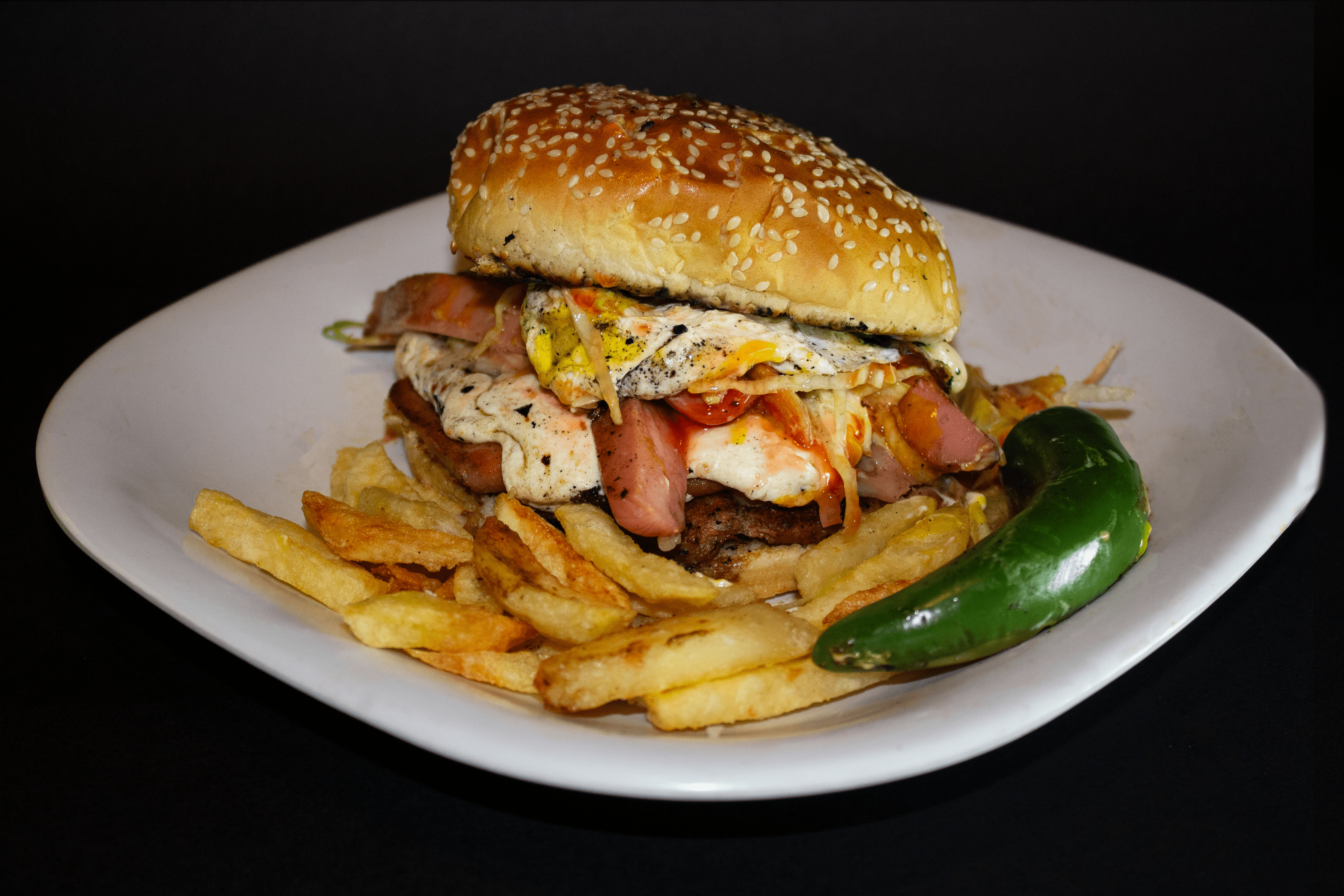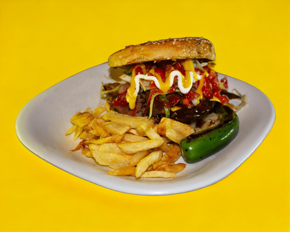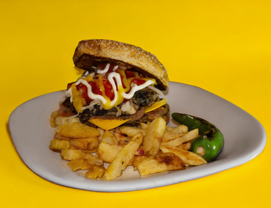 250 g de carne de res, queso amarillo, jamón, salchicha, papas a la francesa.