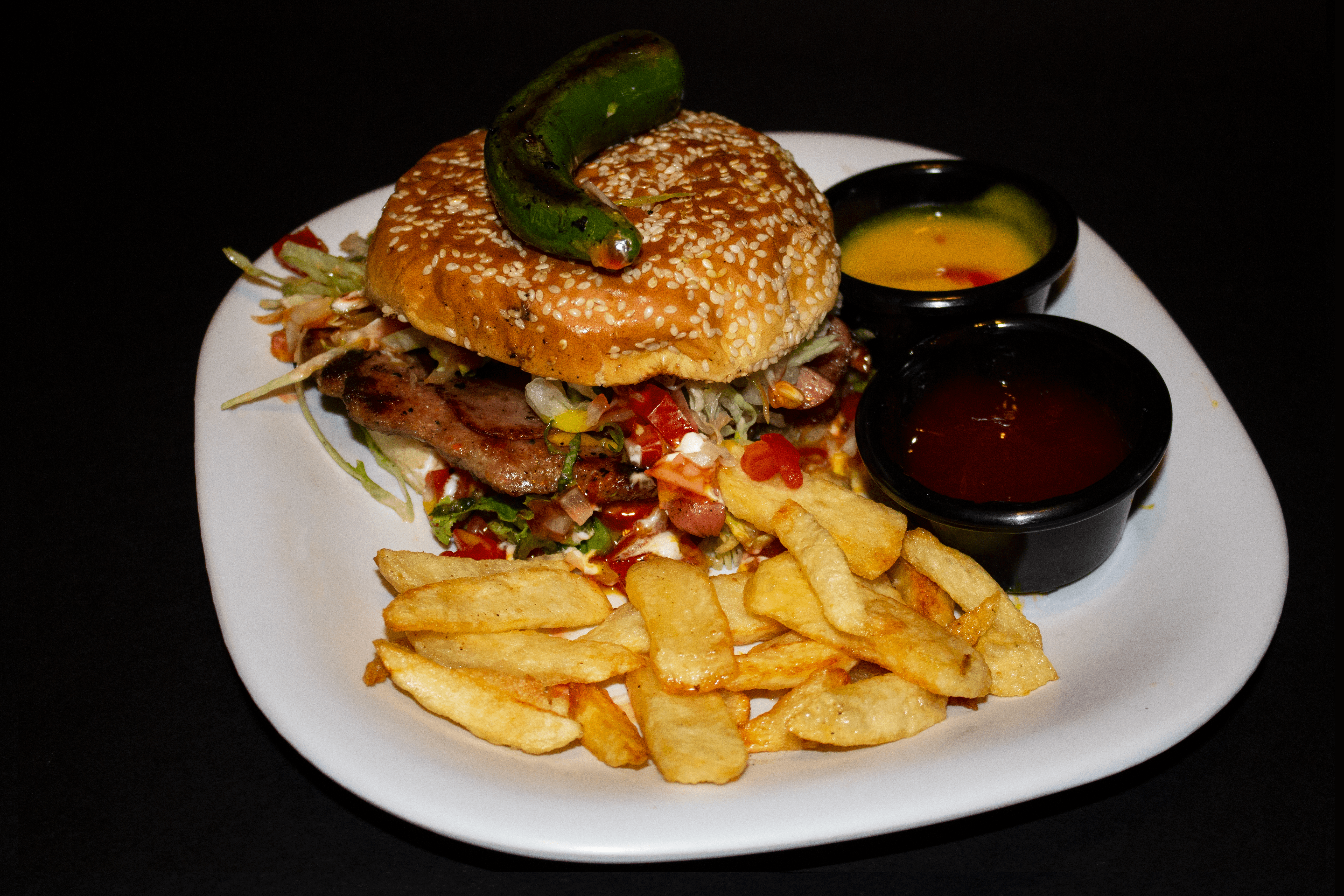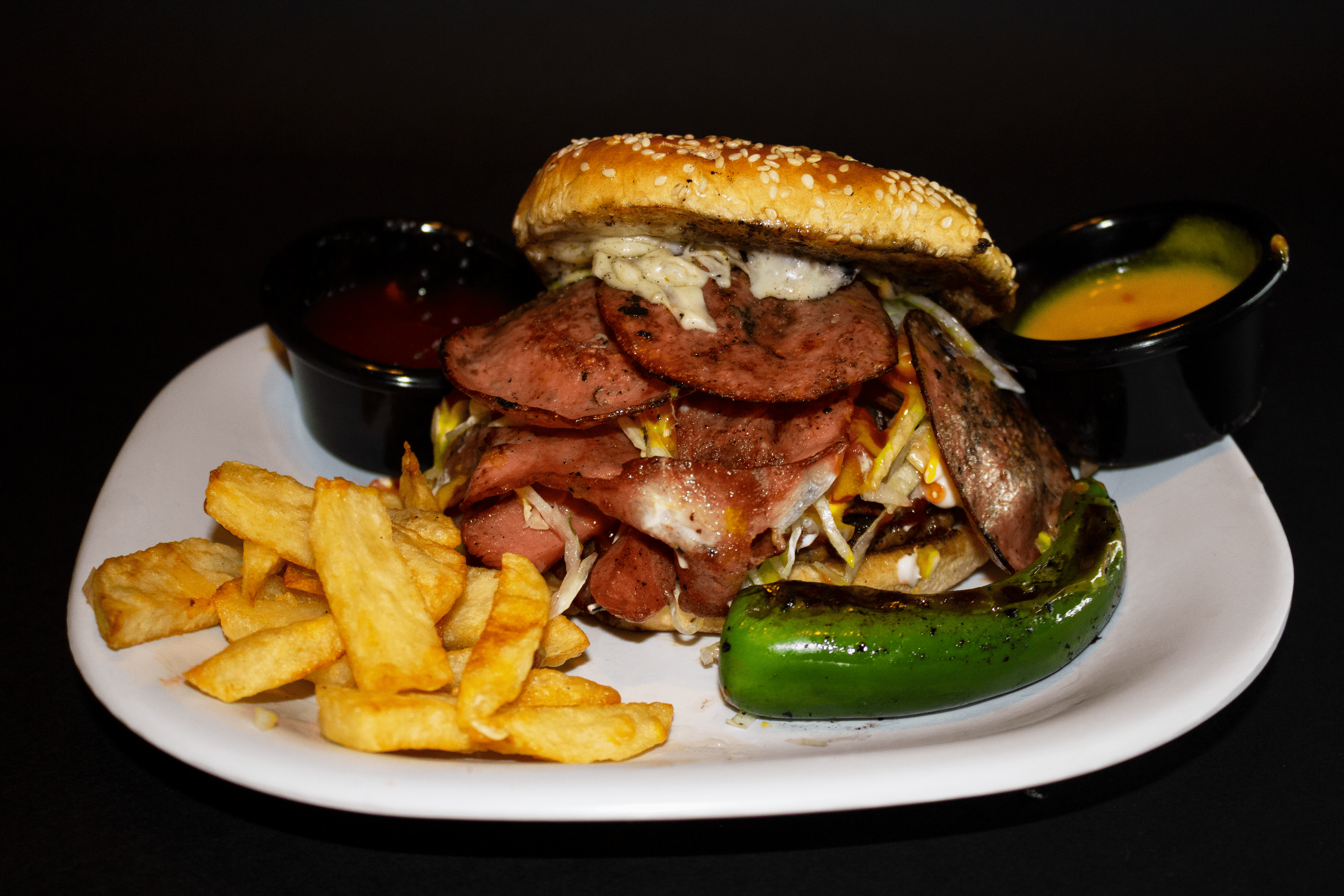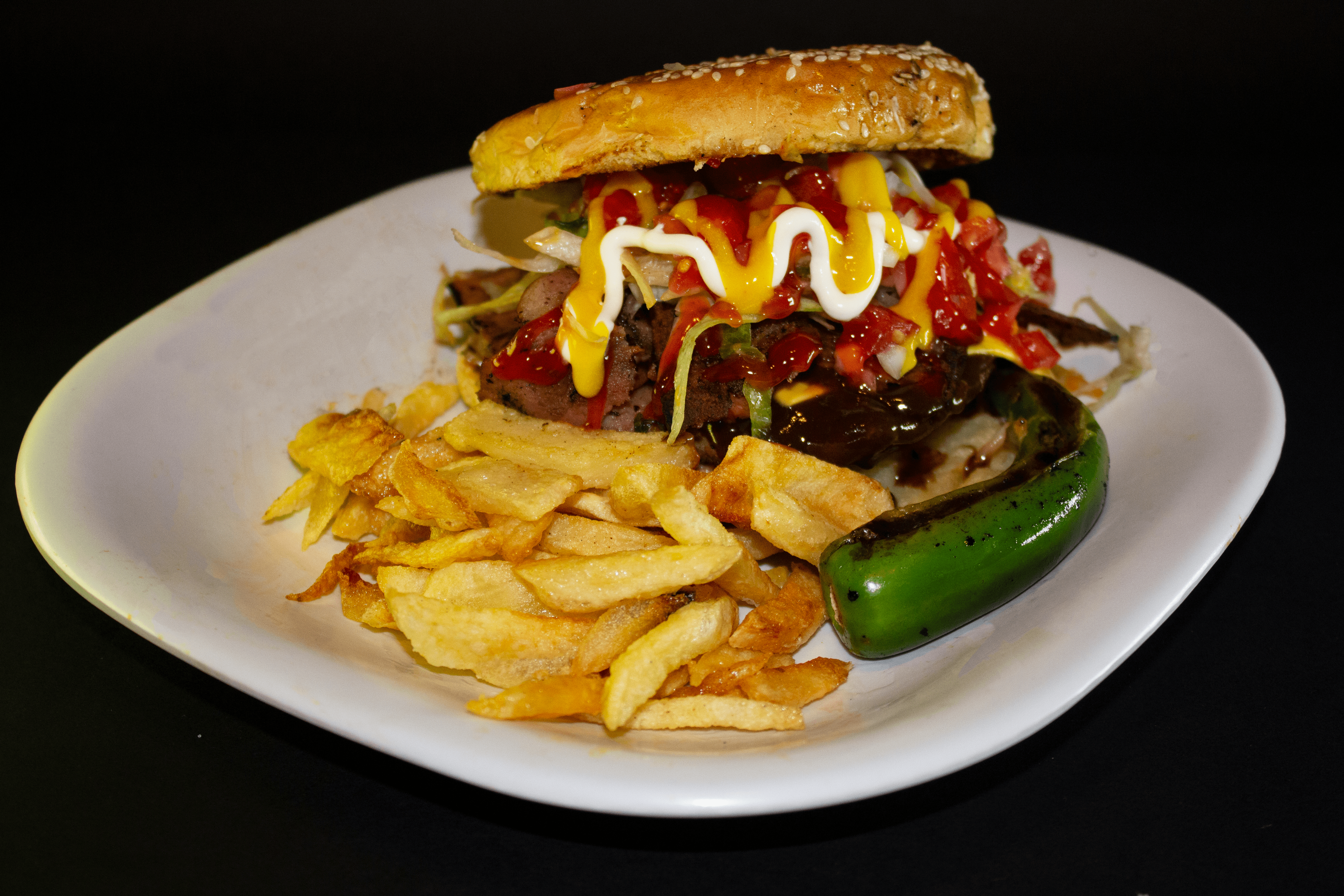 250 g de carne de res, queso amarillo, jamón, salchicha, papas a la francesa.