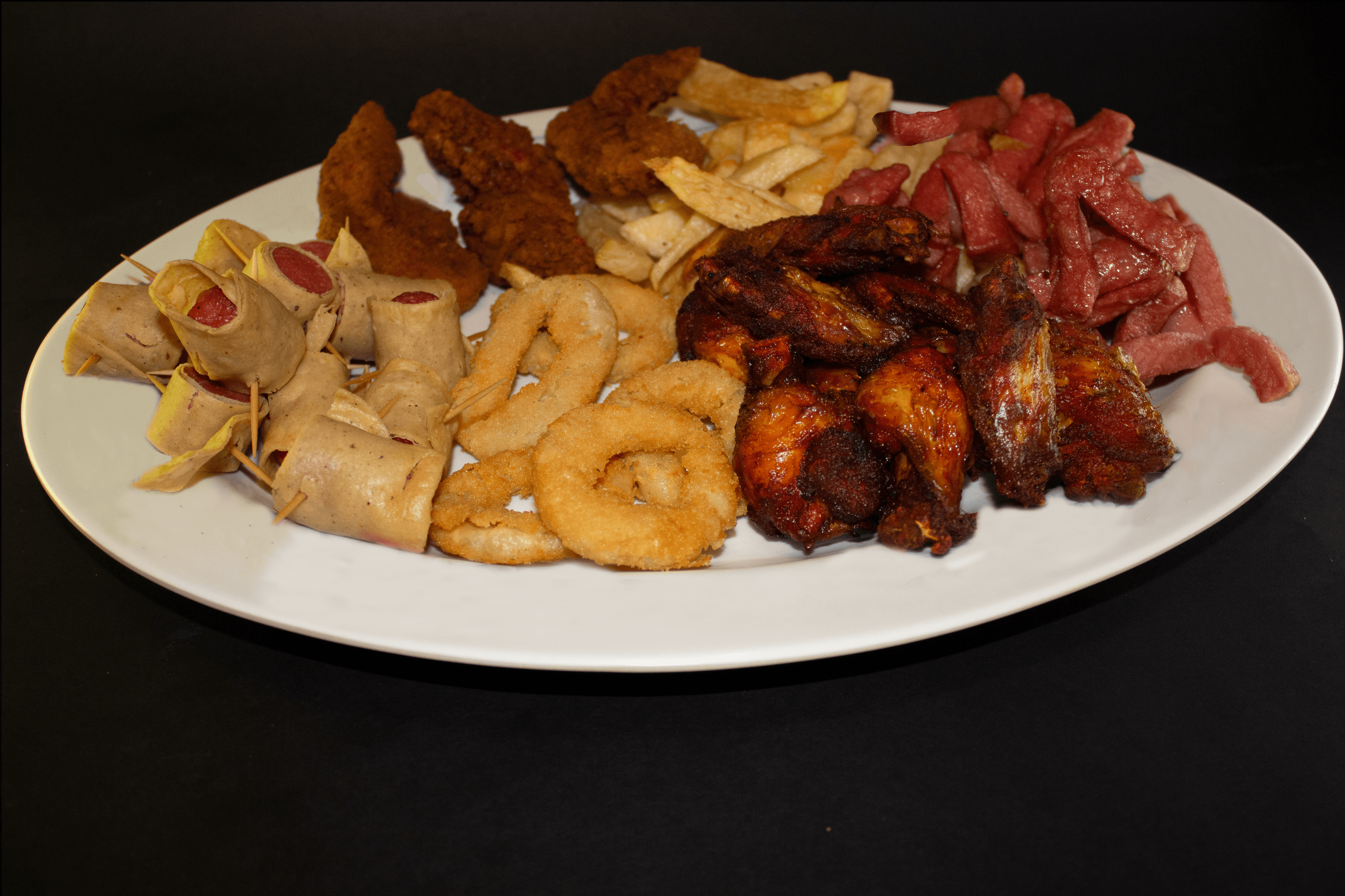Papas a la Francesa*1 + Salchitacos*1 + Salchipulpos*1 + Orden de Alitas 10 pzas*1 + Tenders Tiras de Pollo 6 pzas*1 + Aros de Cebolla*1