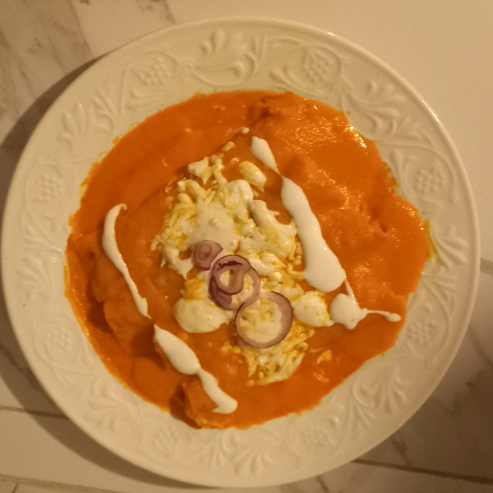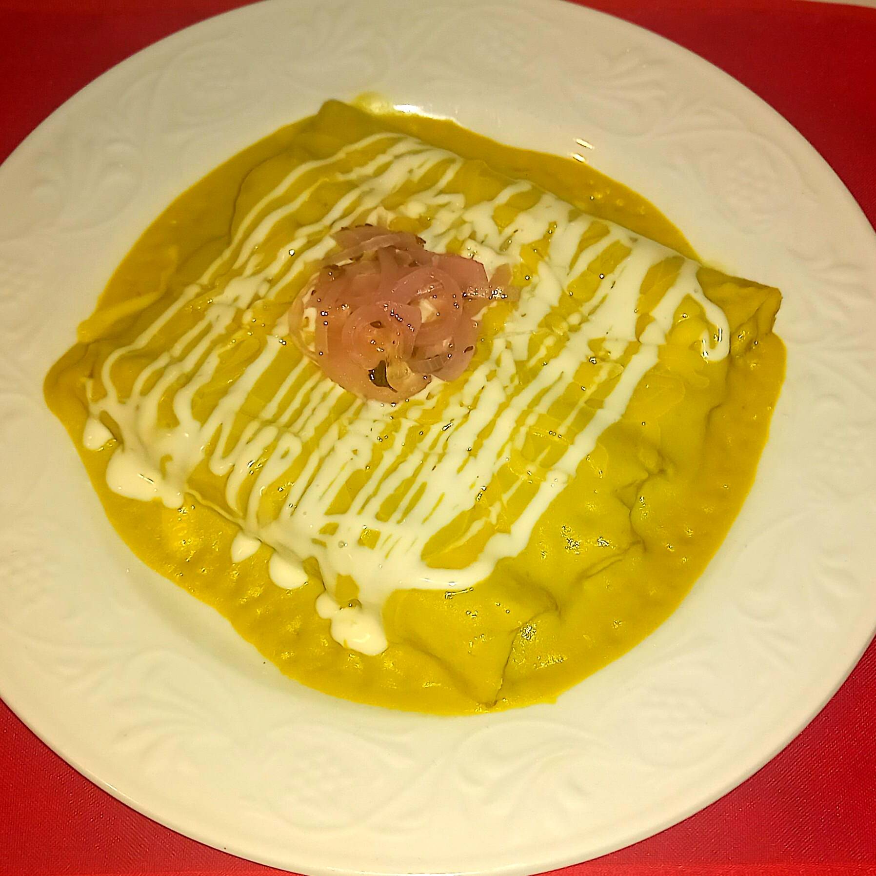 5 tortillas rellenas de pollo bañadas en salsa a base e tomate picosita acompañadas de queso gouda gratinado y cebolla morada encuitida