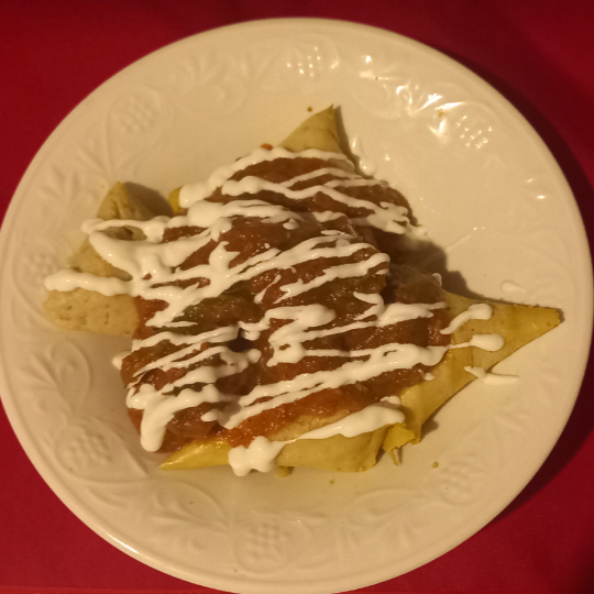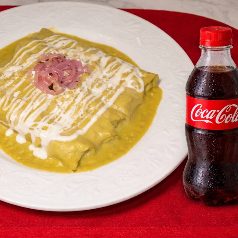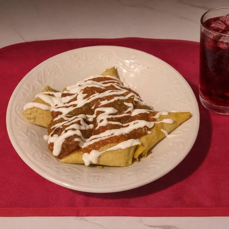 5 Tortillas de maiz rellenas de pollo bañada en deliciosa salsa a base de jitomate acompañada de crema y queso
