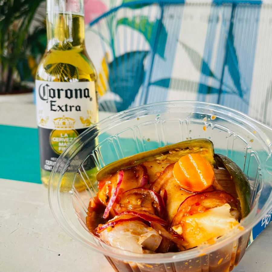 Sal, limon, tajin, salsas negras, clamato y cerveza.