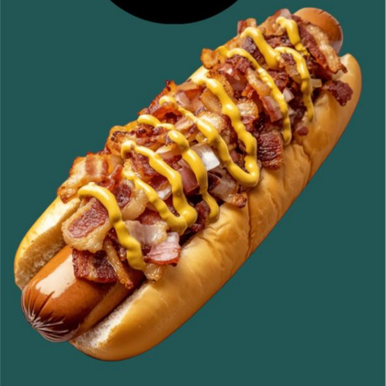 Salchicha de res de primera calidad, acompañada de tocino, queso, pepinillos y mayonesa.
