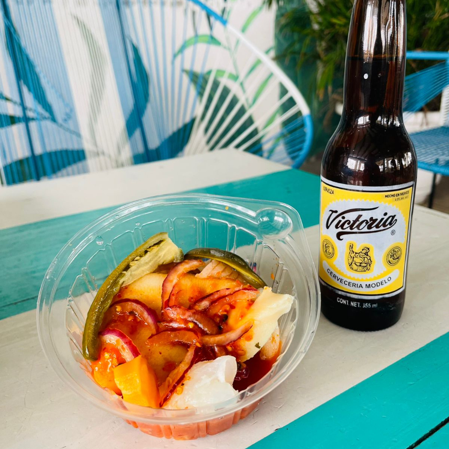 Limon, miguelito, saborizante de chamoy y cerveza.