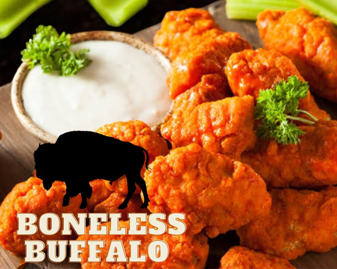 8 piezas (400grs aprox. en crudo) de Deliciosos boneless marinados con salsa búfalo y aderezados con salsa ranch acompañados con papas fritas y tocino