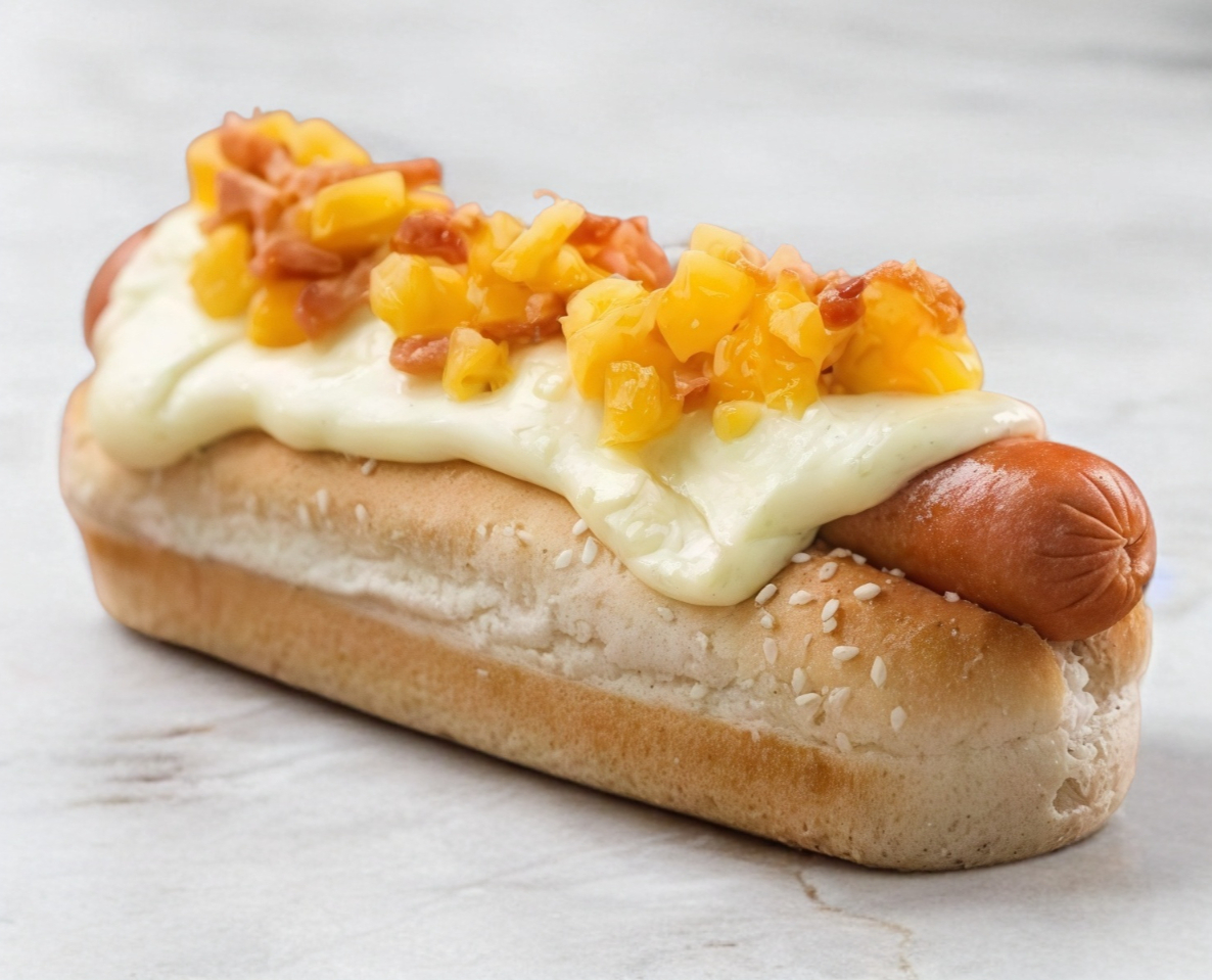 Salchicha de pavo, tocino, queso asadero, pepperoni, mayonesa, mostaza y cátsup.