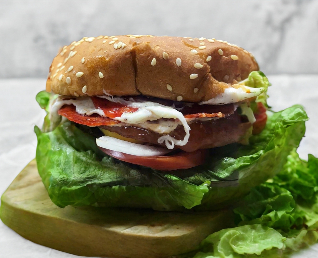 Carne de res, tocino, queso amarillo, jamón, huevo estrellado, lechuga italiana, jitomate, cebolla, mayonesa, mostaza, cátsup y chile toreado.