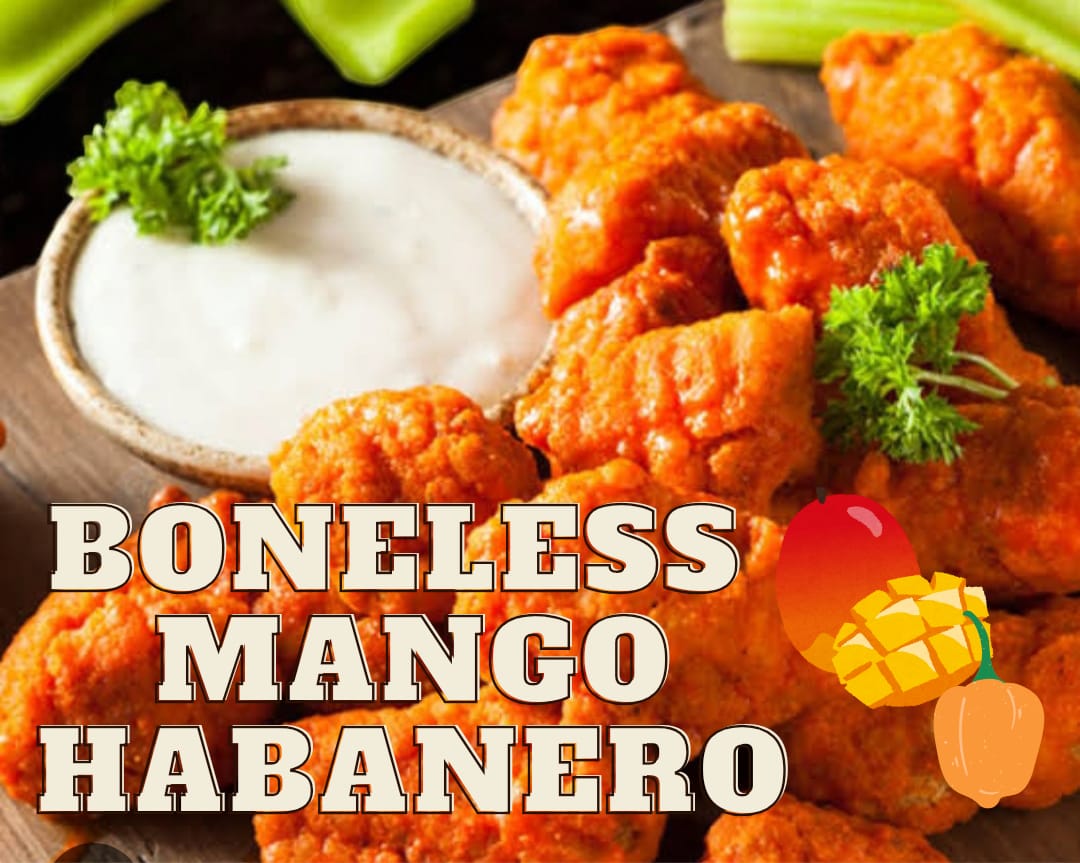 8 piezas (400grs aprox. en crudo) de Deliciosos boneless marinados con salsa mango habanero y aderezados con salsa ranch acompañados con papas fritas y tocino