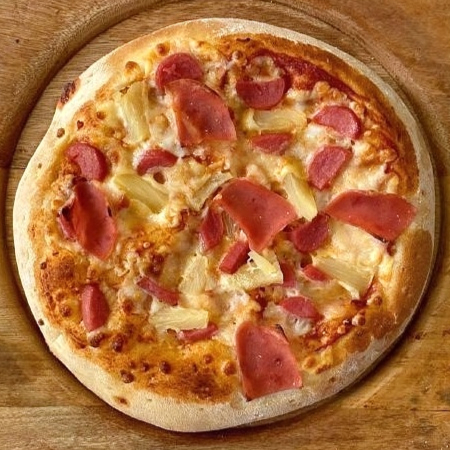 Deliciosas pizza Personal de masa madre, con queso asadero y boneless bañados en salsa mango habanero y con un toque de salsa ranch