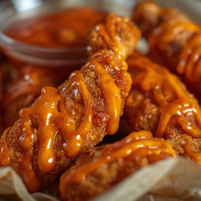 Deliciosos tenders de pollo, sabor Buffalo acompañados con papas fritas