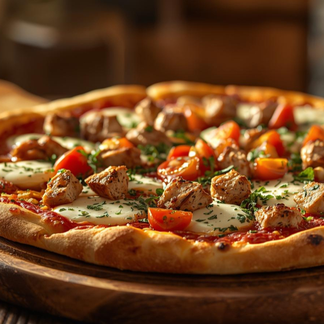 Deliciosas pizza de masa madre con queso asadero y boneless bañados en salsa Buffalo, acompañados de un toque de salsa ranch