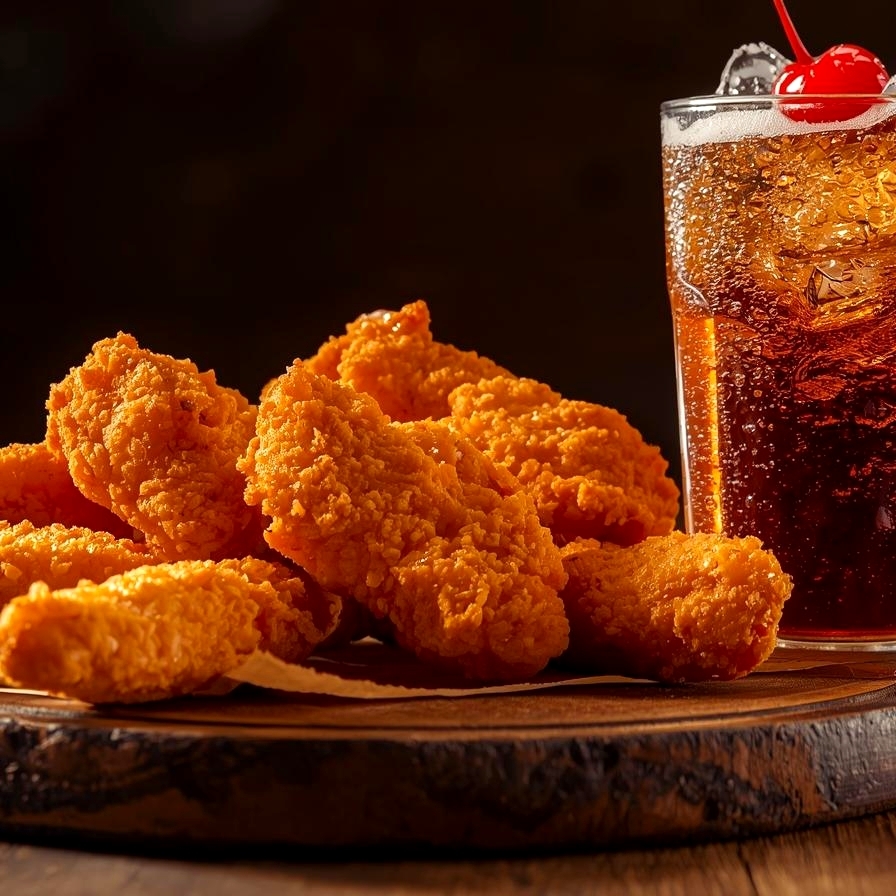 8 piezas (400grs aprox. en crudo) de Deliciosos boneless marinados con salsa BBQ y aderezados con salsa ranch acompañados con papas fritas y tocino