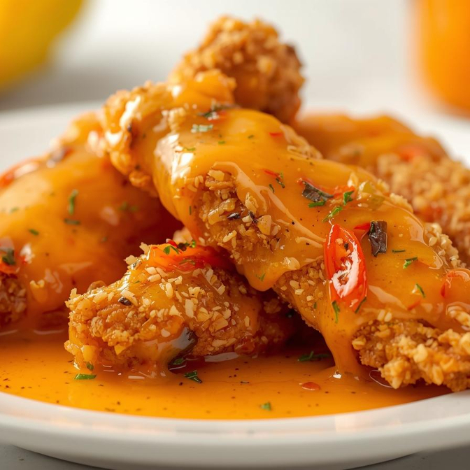 Deliciosos tenders de pollo, sabor mango habanero acompañados con papas fritas